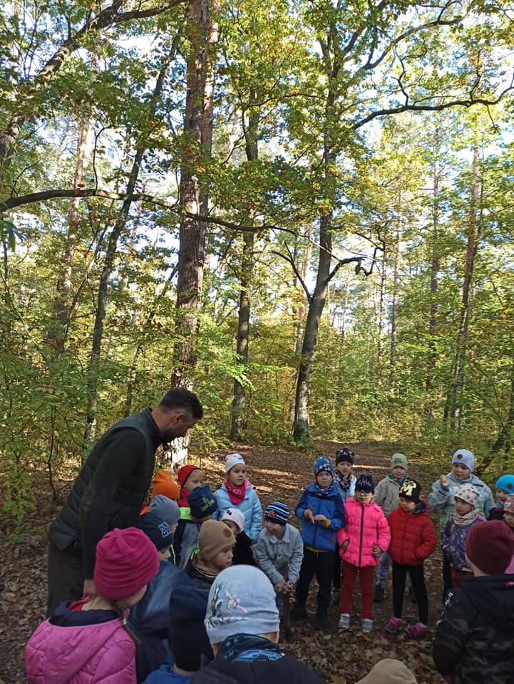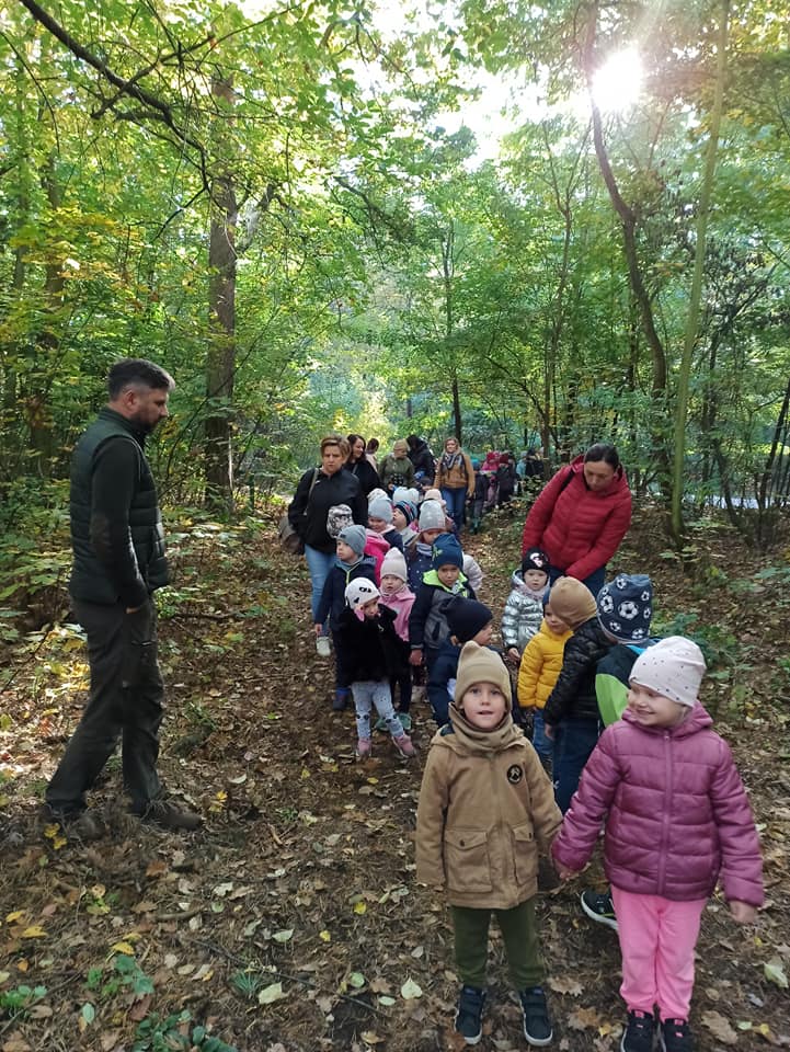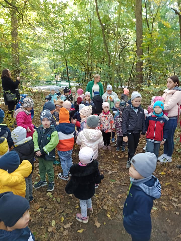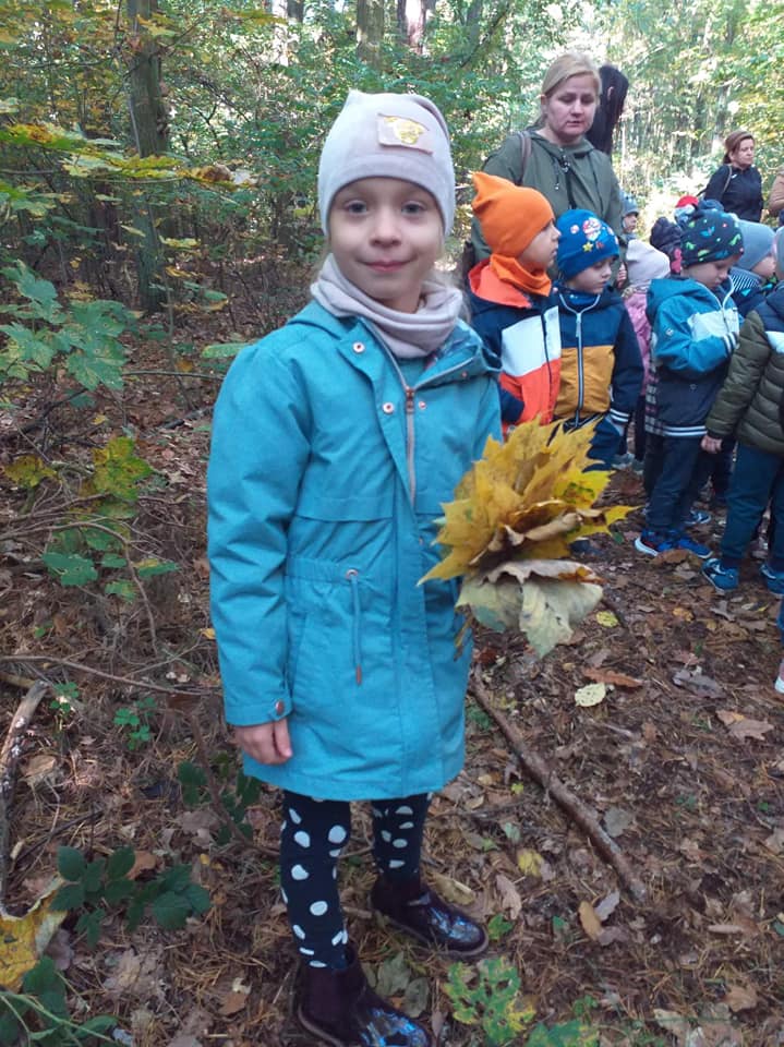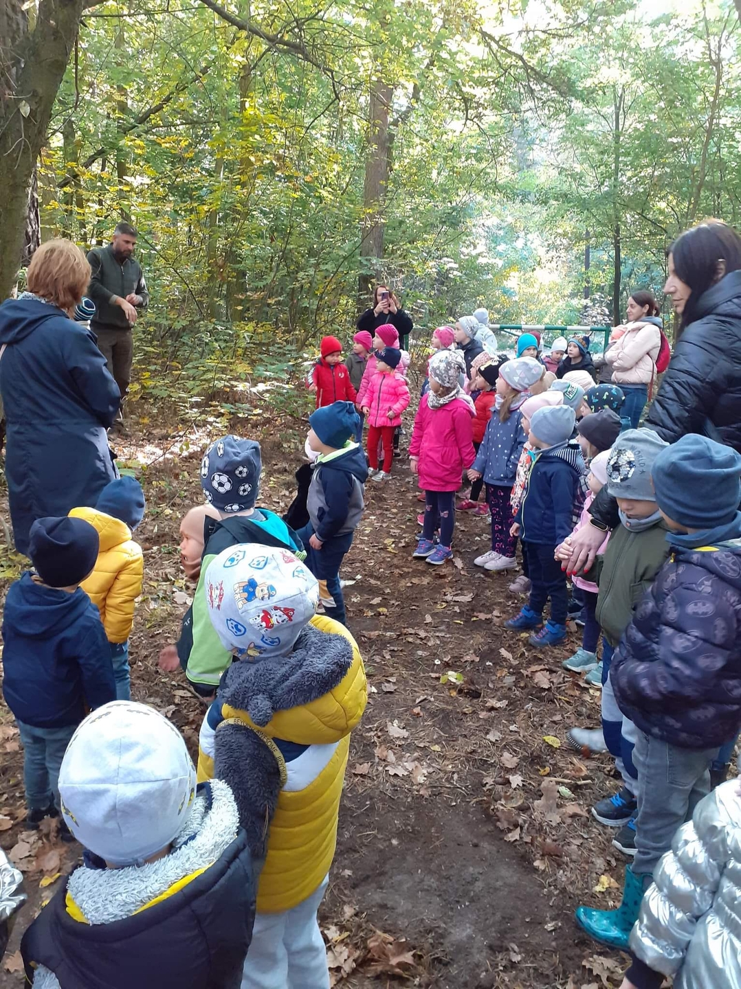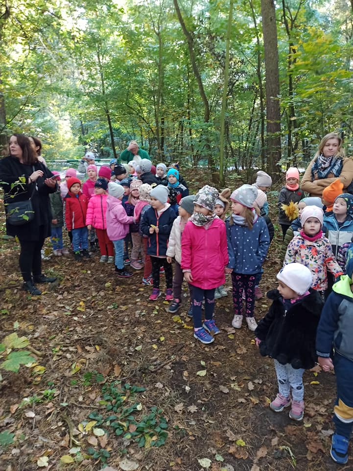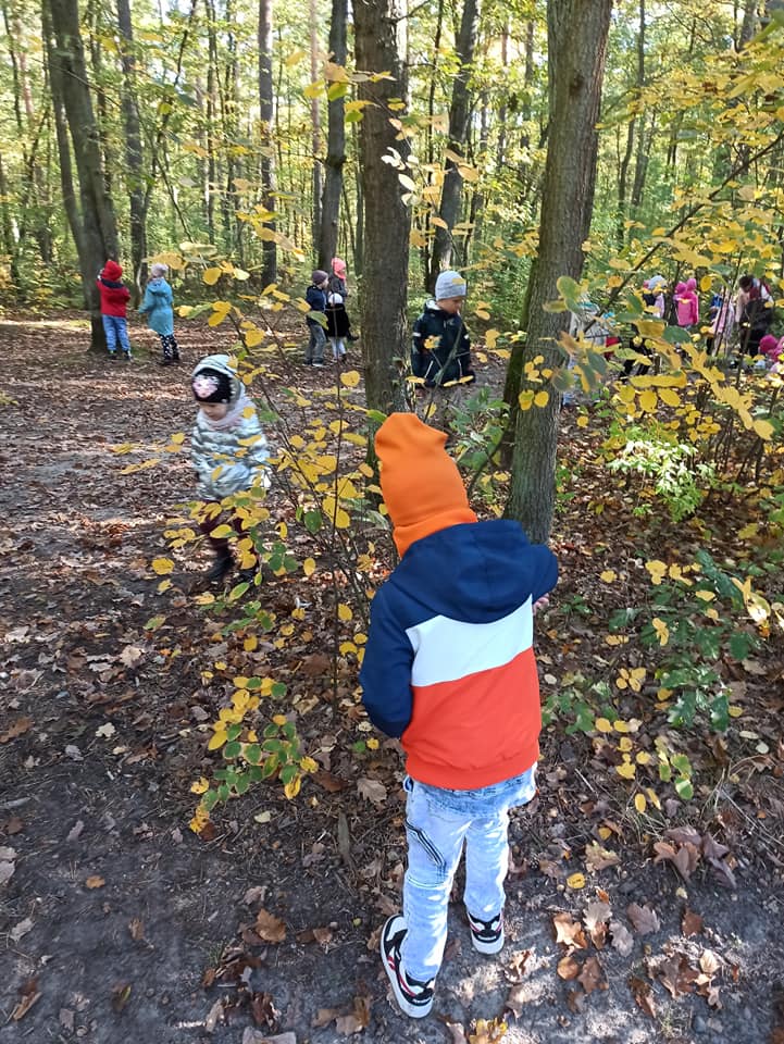 Przy pięknej pogodzie, jesiennych promieniach słonecznych dzieci maszerowały przez las poszukując jego mieszkańców i darów pod przewodnictwem pana leśnika Szymona Wasiaka, tatusia Agatki. Przedszkolaki wykazały się świetną znajomością drzew