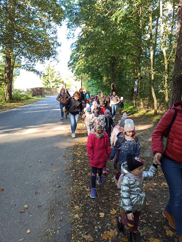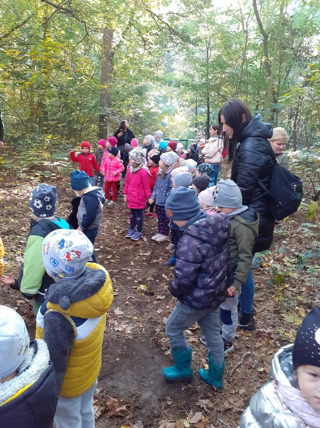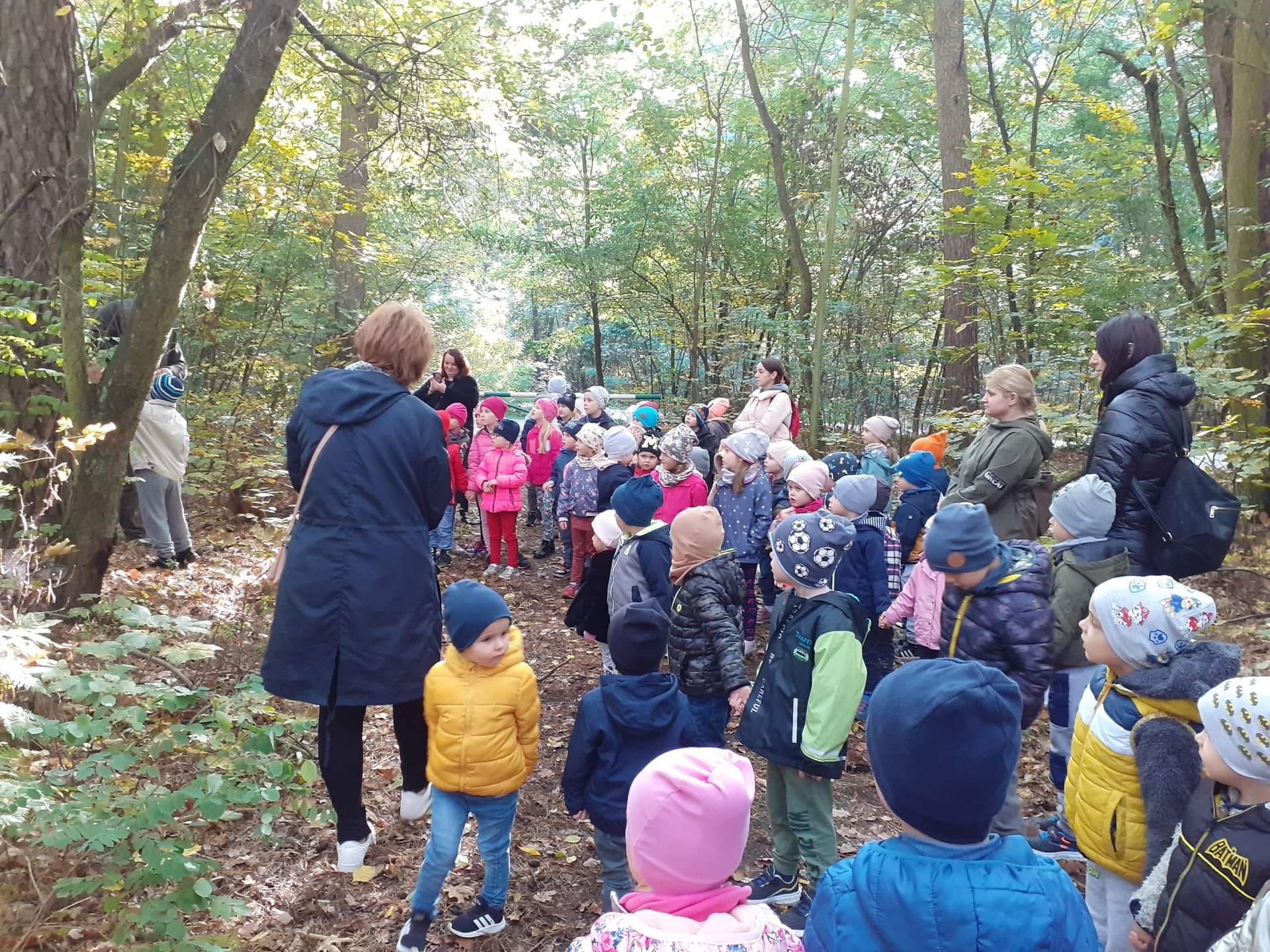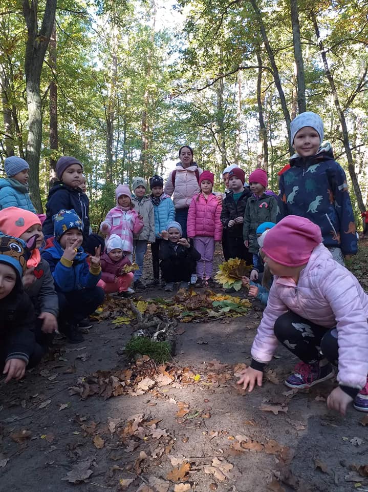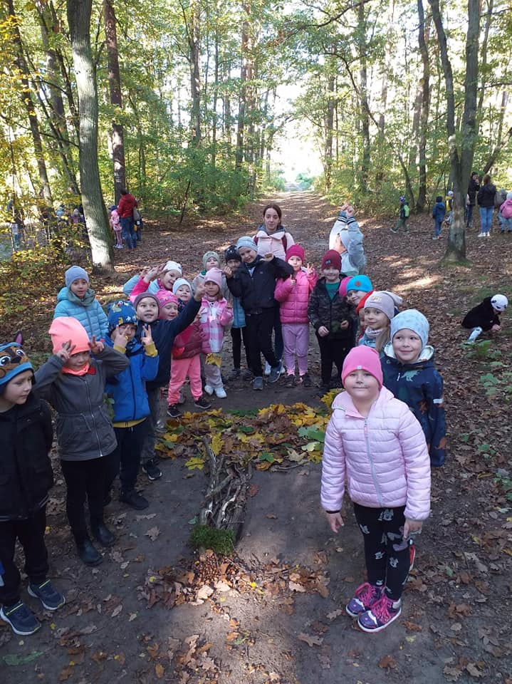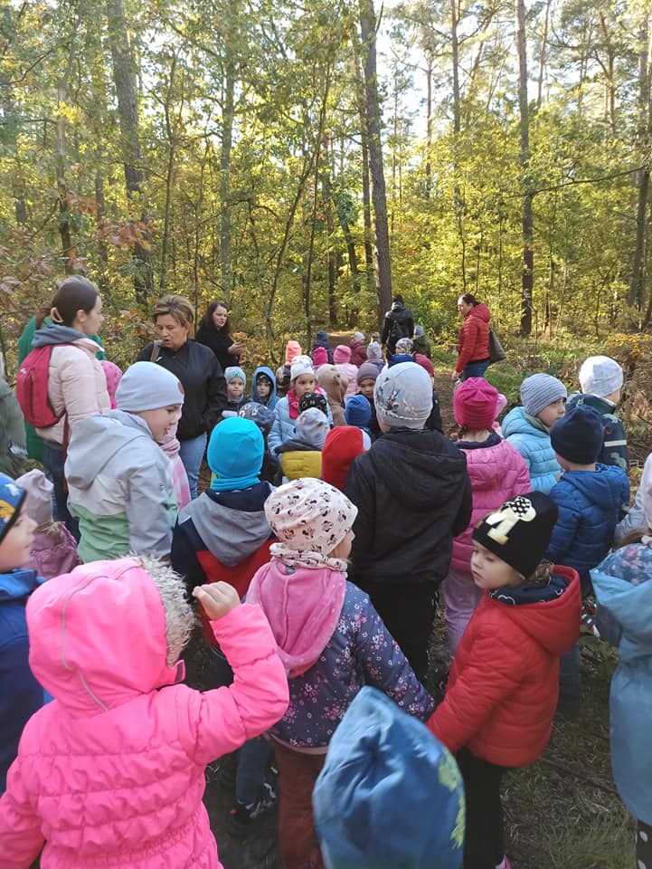Przy pięknej pogodzie, jesiennych promieniach słonecznych dzieci maszerowały przez las poszukując jego mieszkańców i darów pod przewodnictwem pana leśnika Szymona Wasiaka, tatusia Agatki. Przedszkolaki wykazały się świetną znajomością drzew
