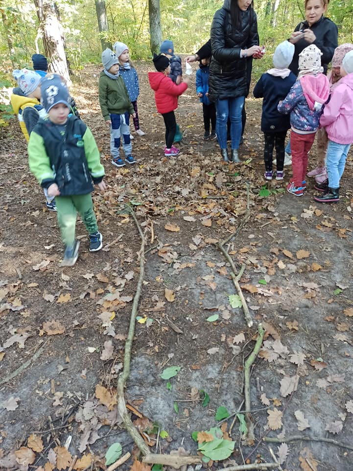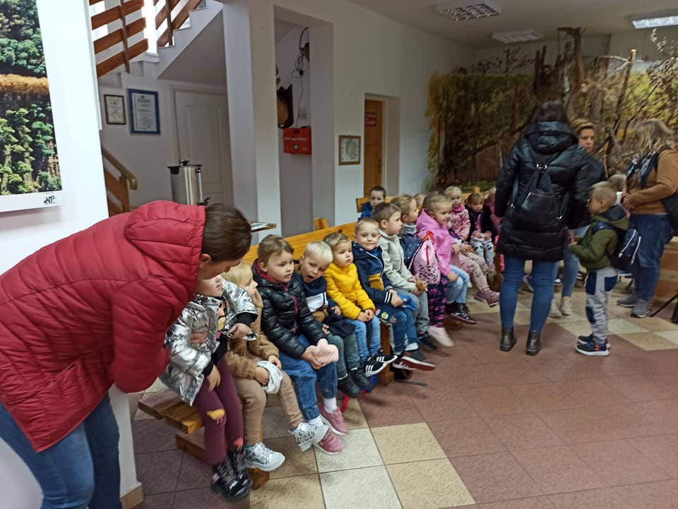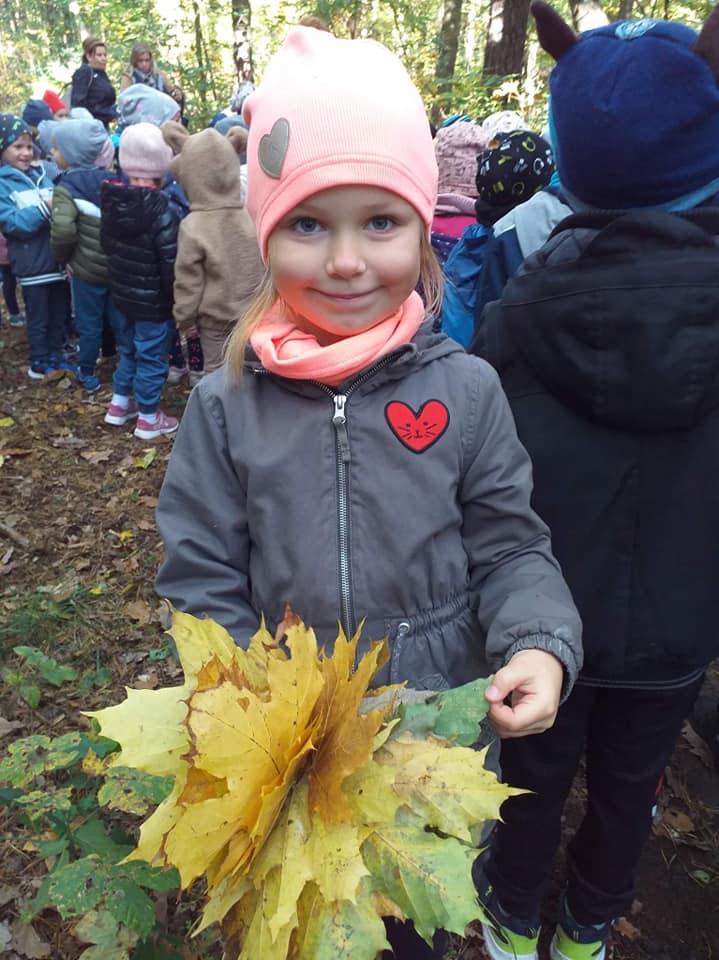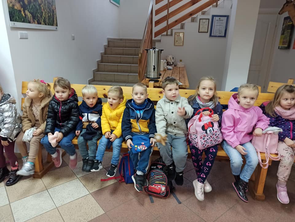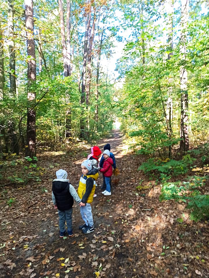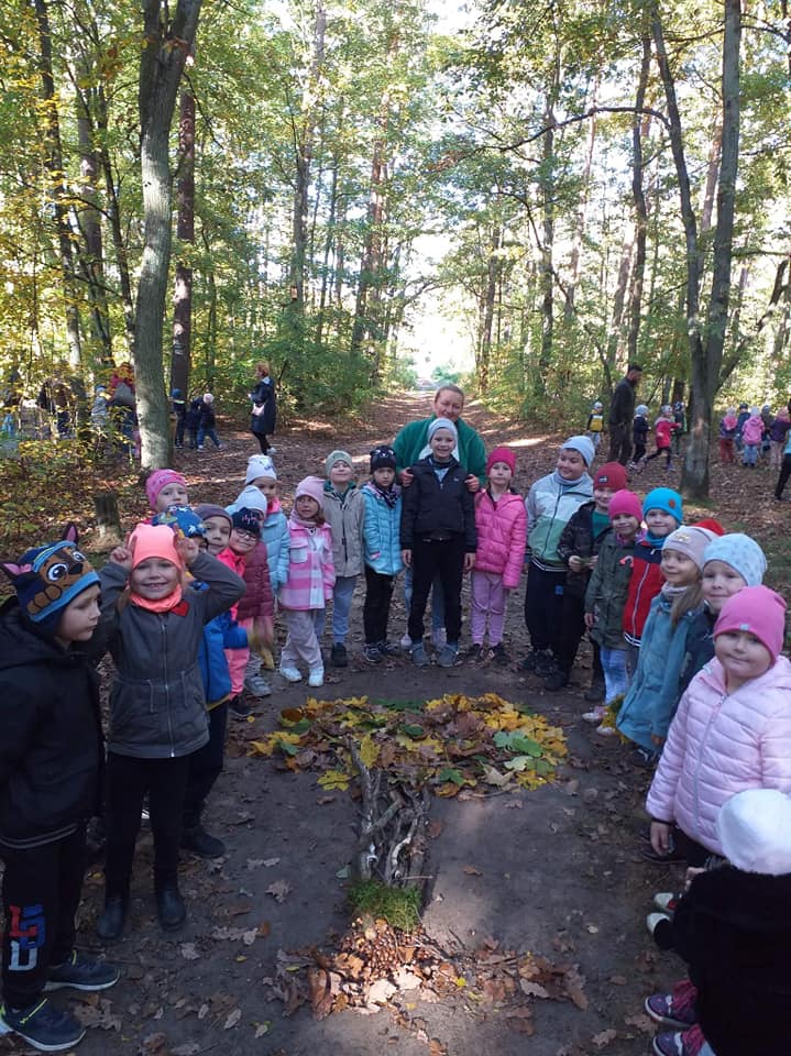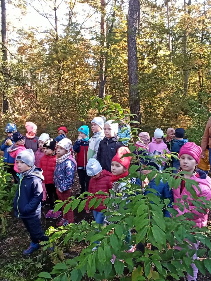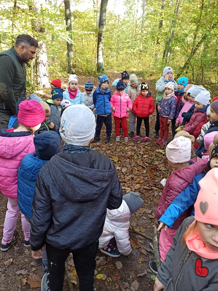 Przy pięknej pogodzie, jesiennych promieniach słonecznych dzieci maszerowały przez las poszukując jego mieszkańców i darów pod przewodnictwem pana leśnika Szymona Wasiaka, tatusia Agatki. Przedszkolaki wykazały się świetną znajomością drzew