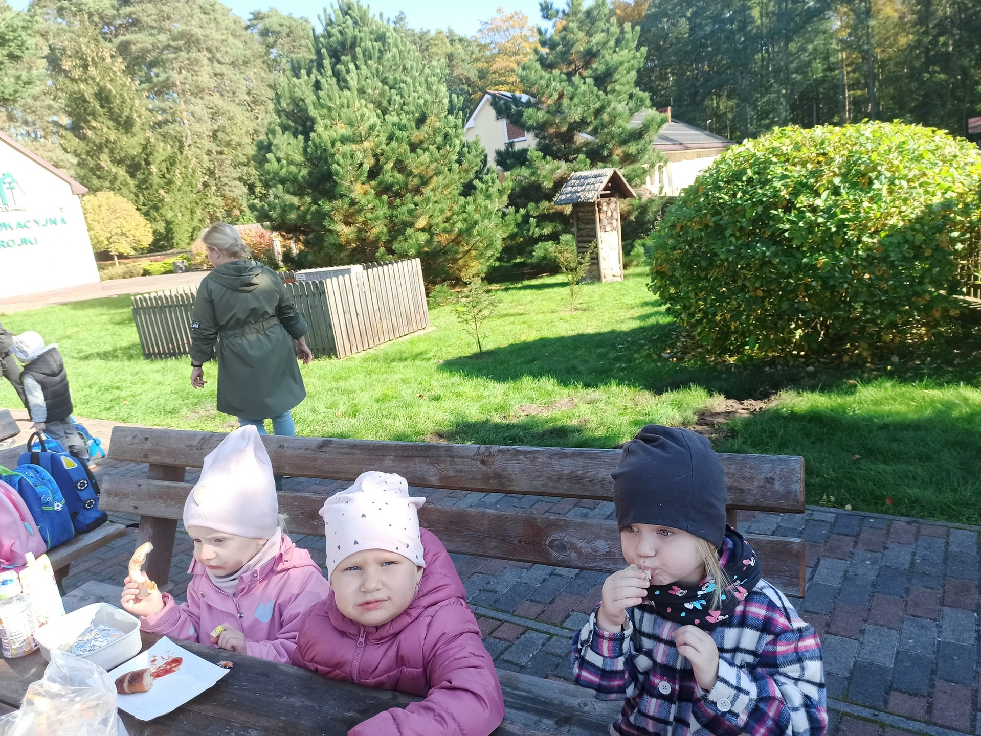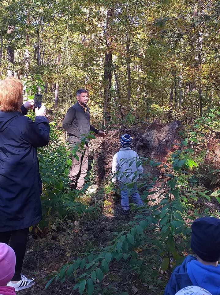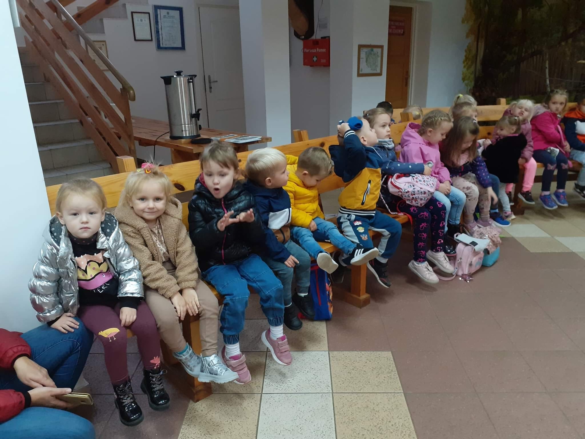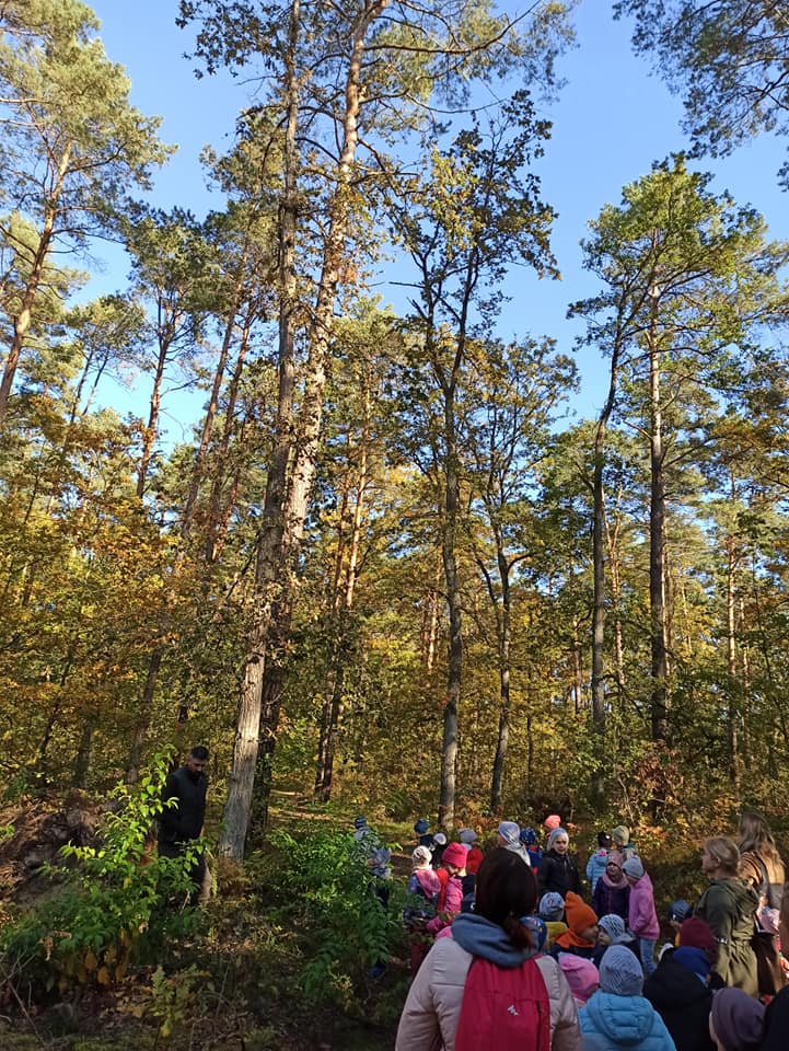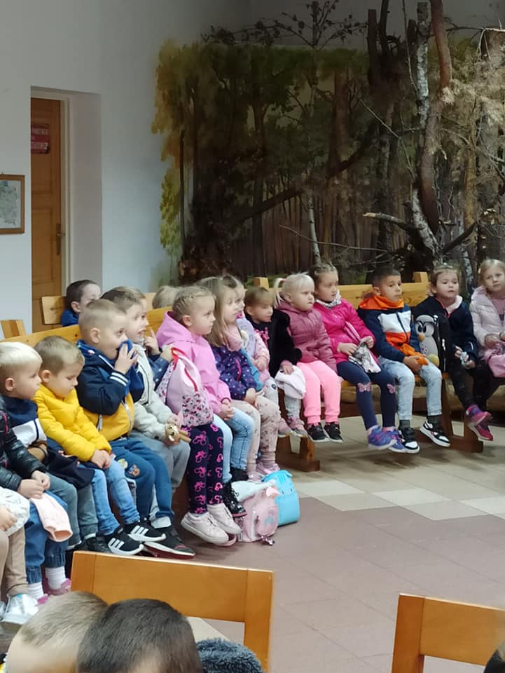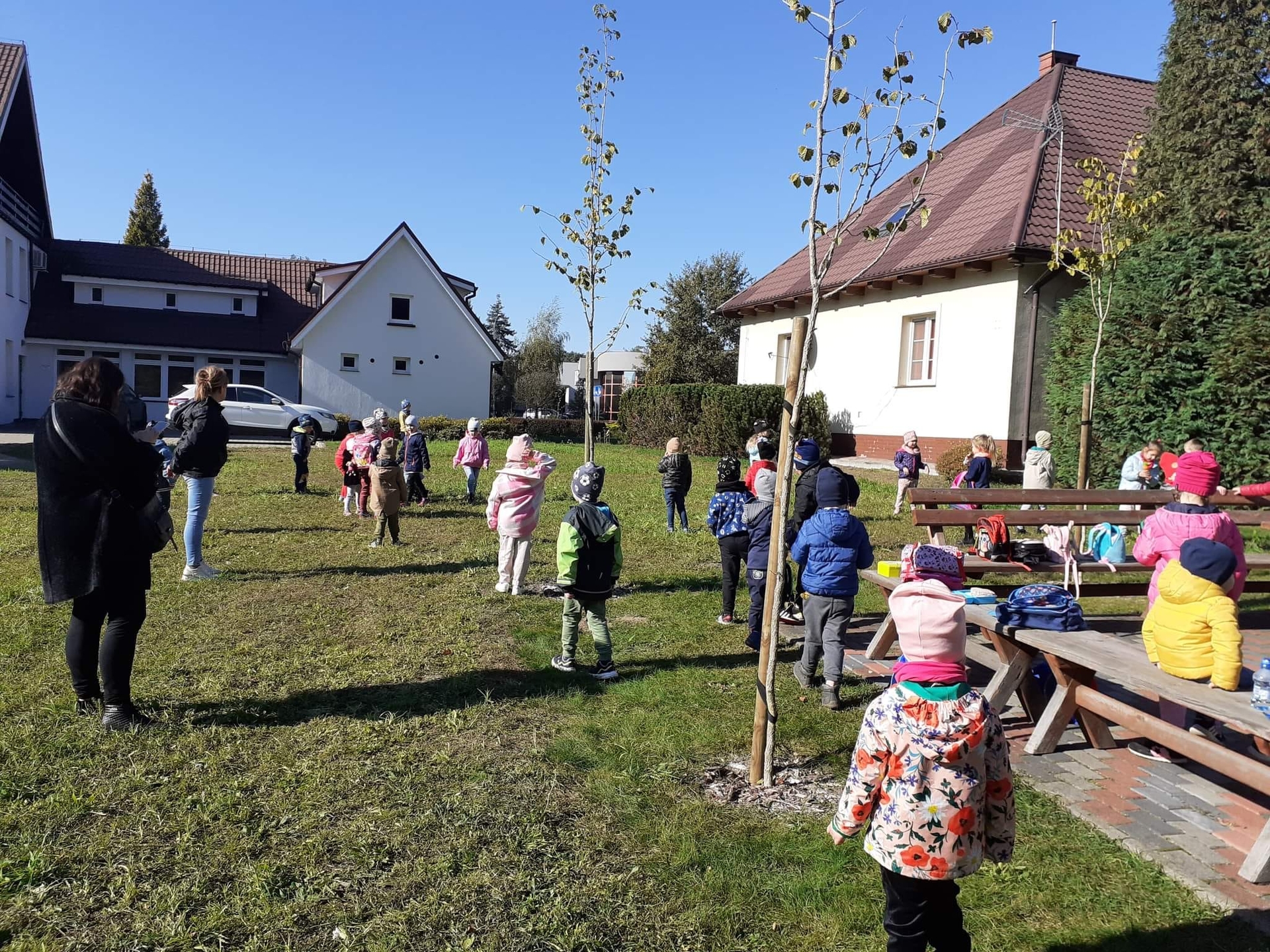 Przy pięknej pogodzie, jesiennych promieniach słonecznych dzieci maszerowały przez las poszukując jego mieszkańców i darów pod przewodnictwem pana leśnika Szymona Wasiaka, tatusia Agatki. Przedszkolaki wykazały się świetną znajomością drzew