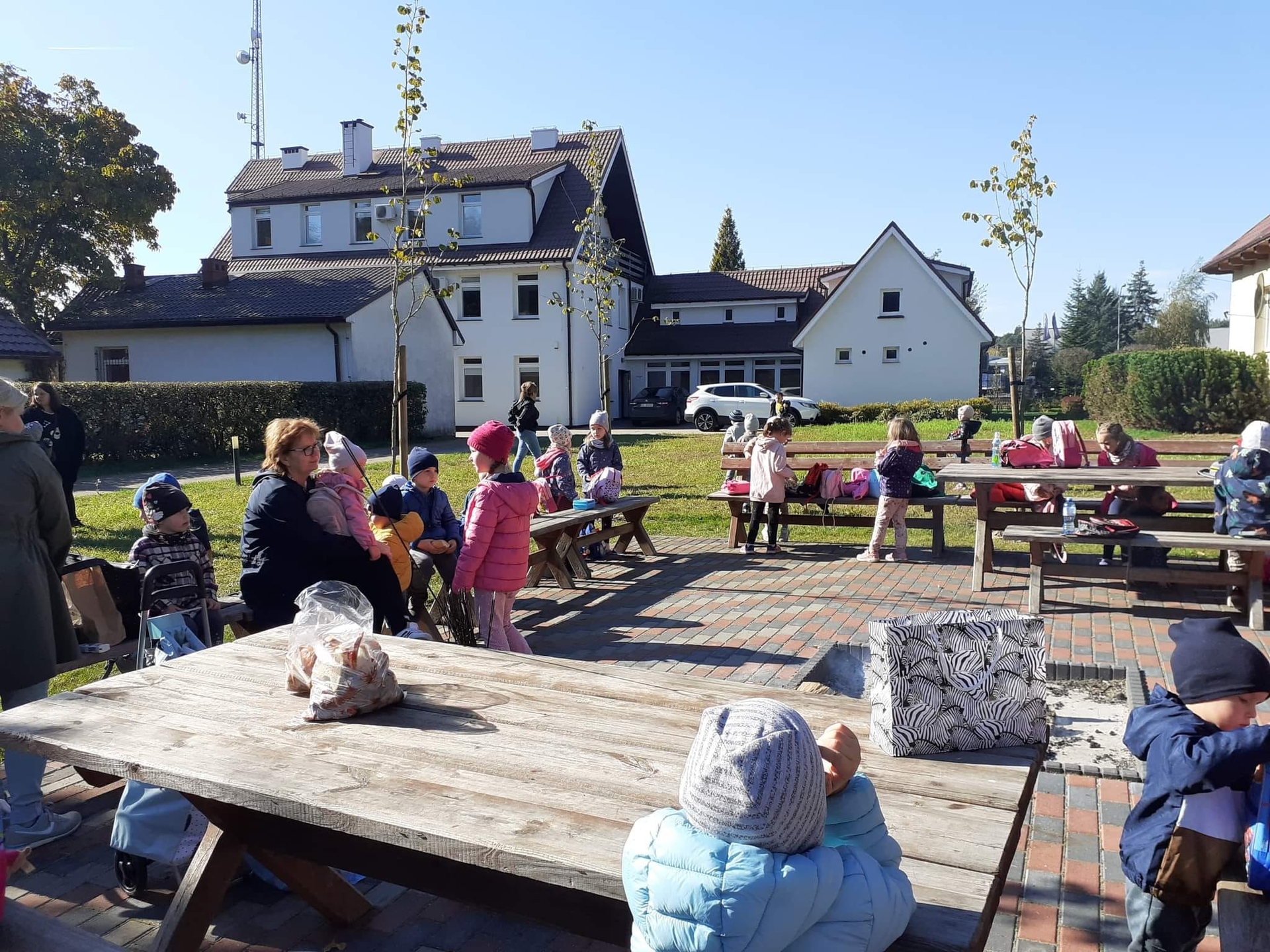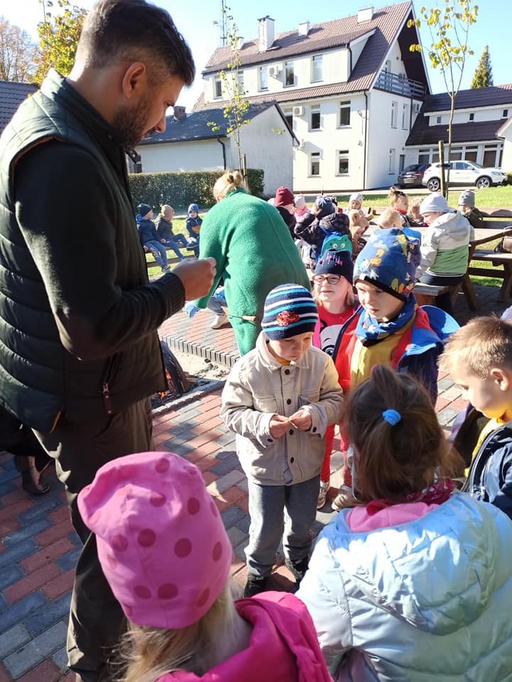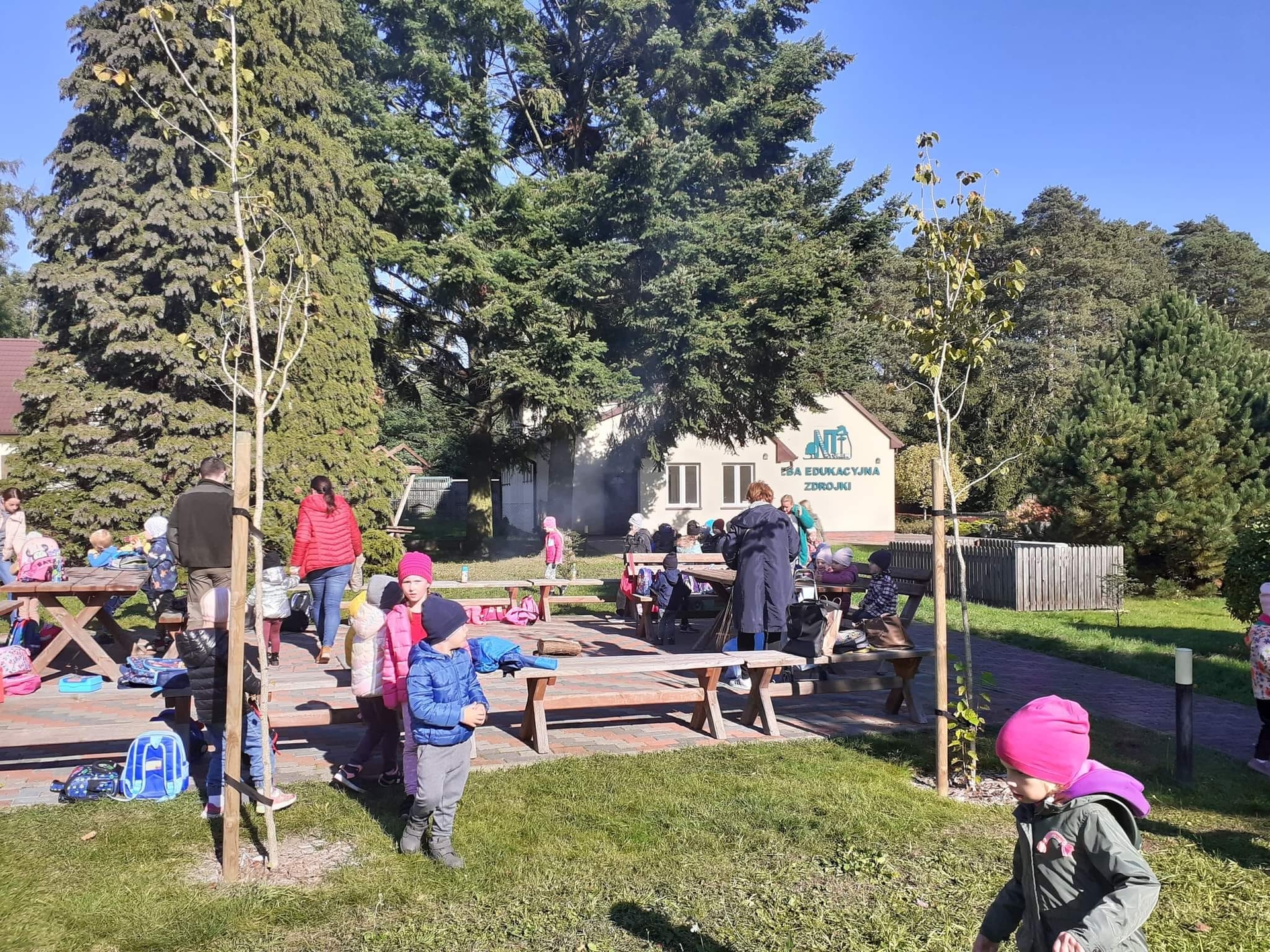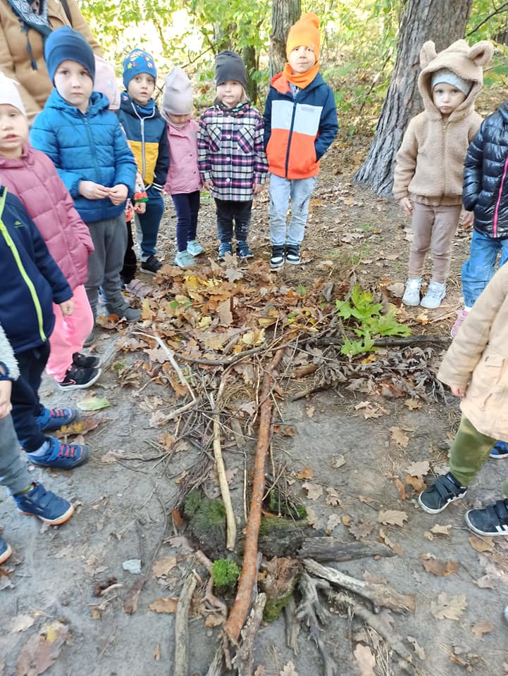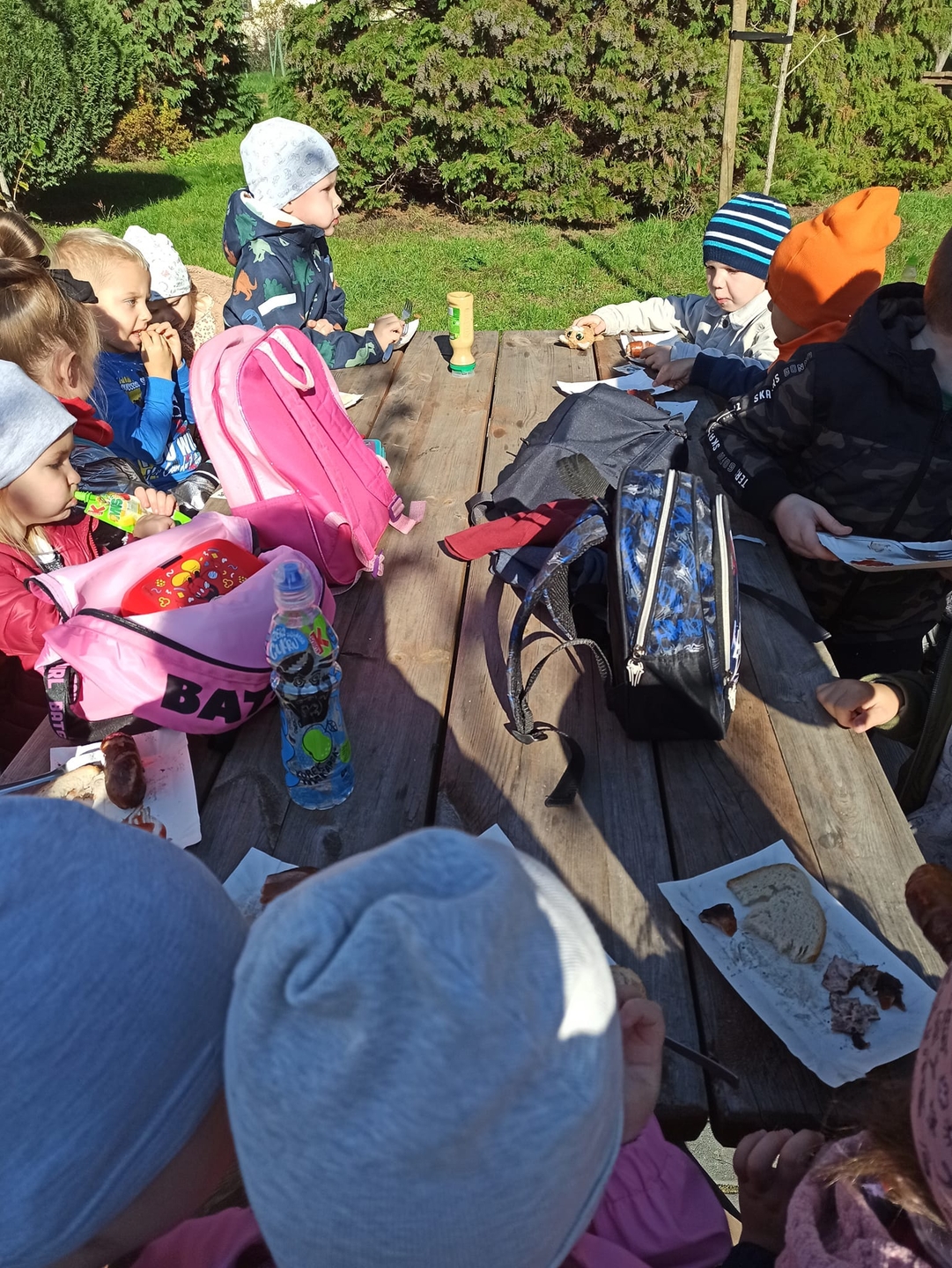 Przy pięknej pogodzie, jesiennych promieniach słonecznych dzieci maszerowały przez las poszukując jego mieszkańców i darów pod przewodnictwem pana leśnika Szymona Wasiaka, tatusia Agatki. Przedszkolaki wykazały się świetną znajomością drzew