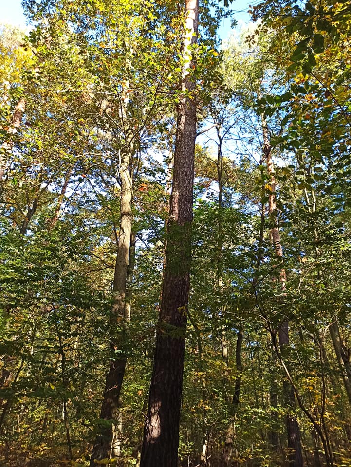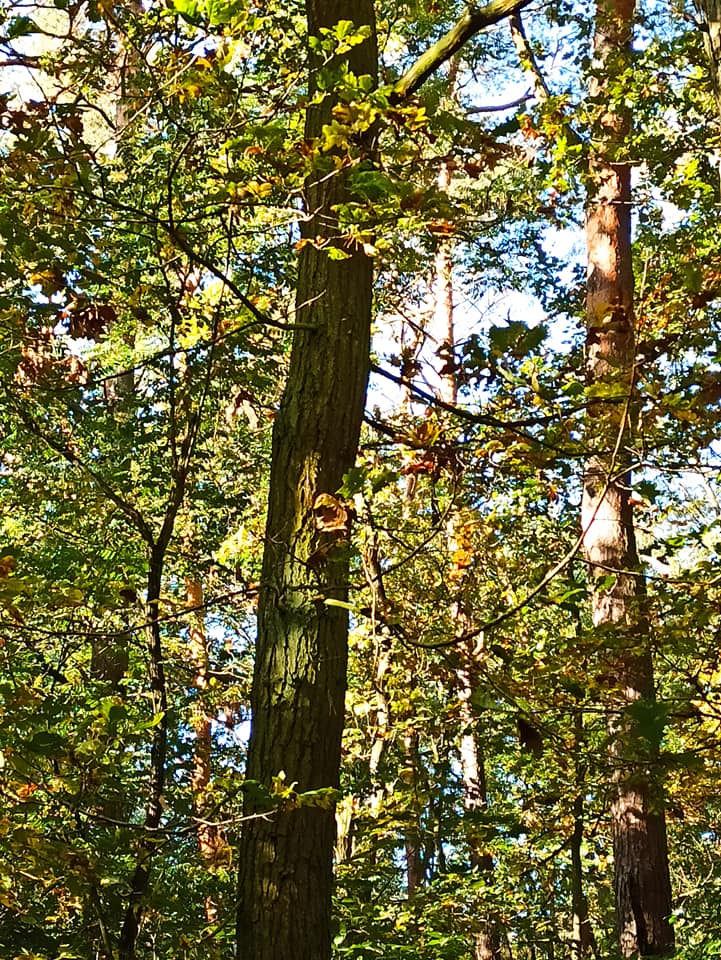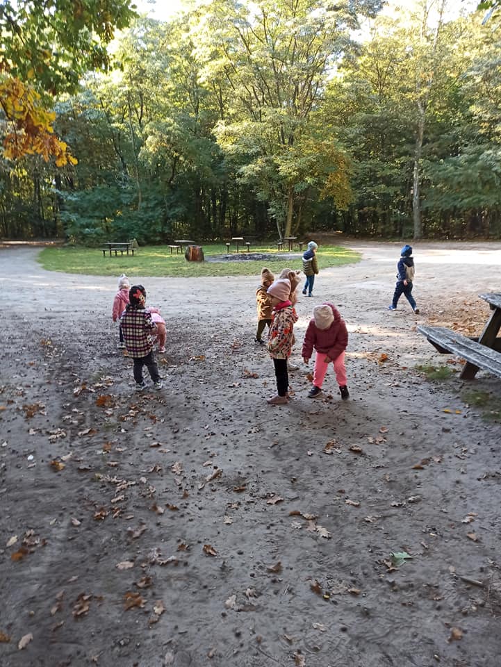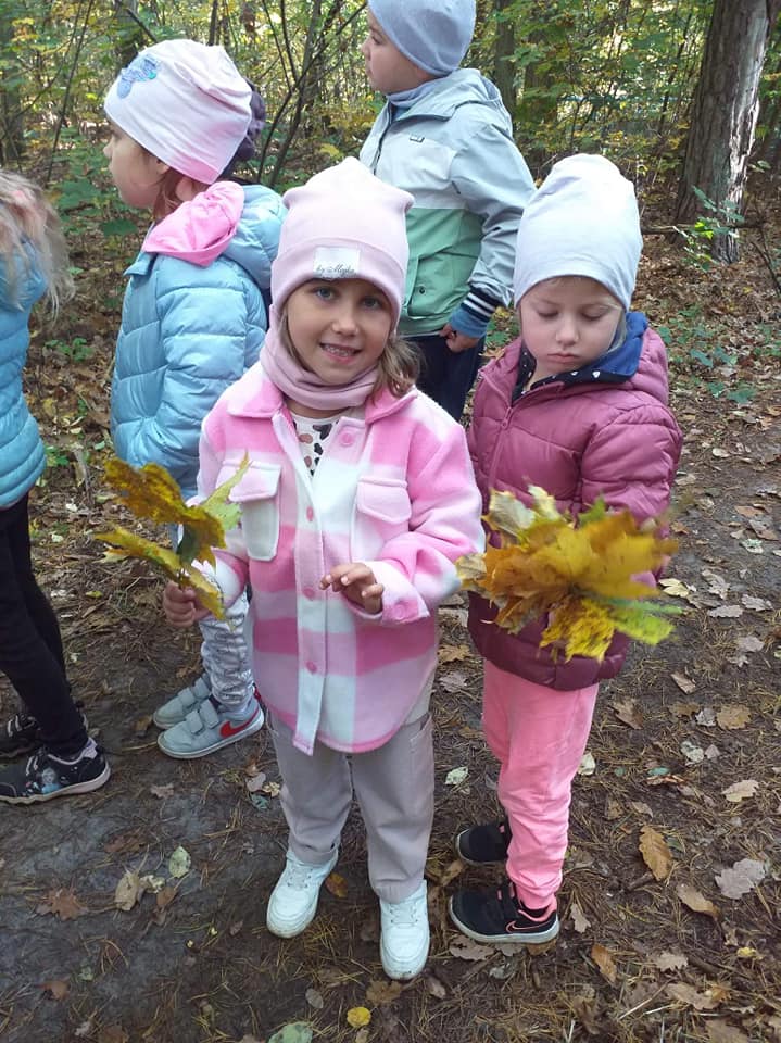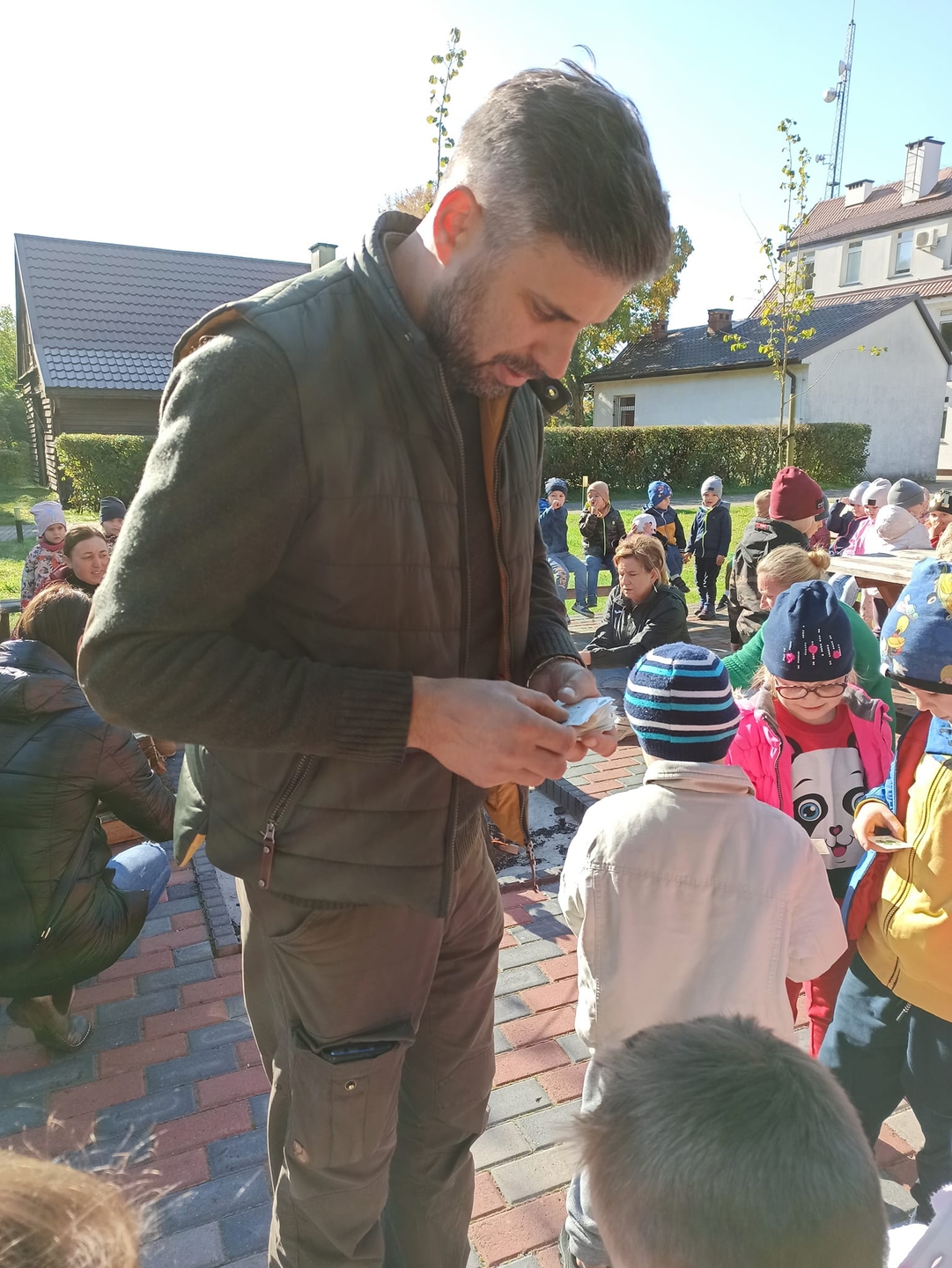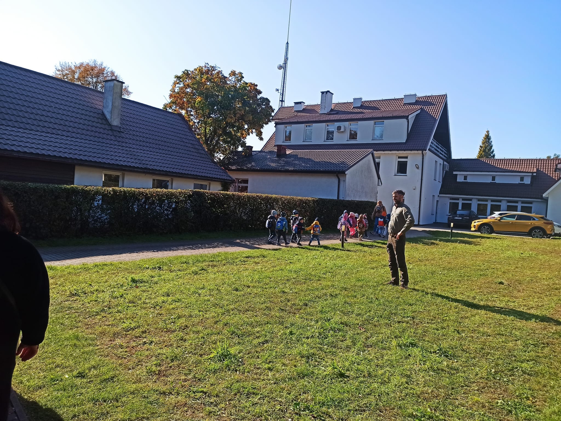 Przy pięknej pogodzie, jesiennych promieniach słonecznych dzieci maszerowały przez las poszukując jego mieszkańców i darów pod przewodnictwem pana leśnika Szymona Wasiaka, tatusia Agatki. Przedszkolaki wykazały się świetną znajomością drzew