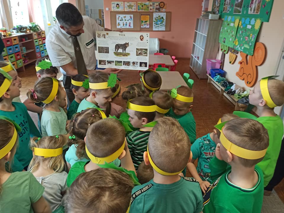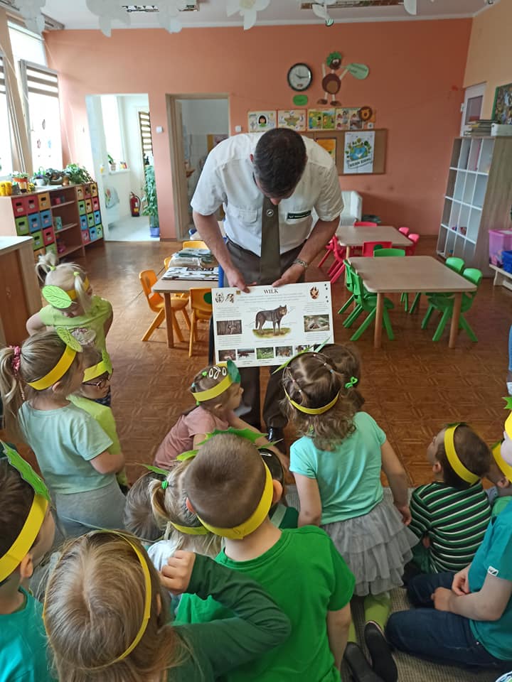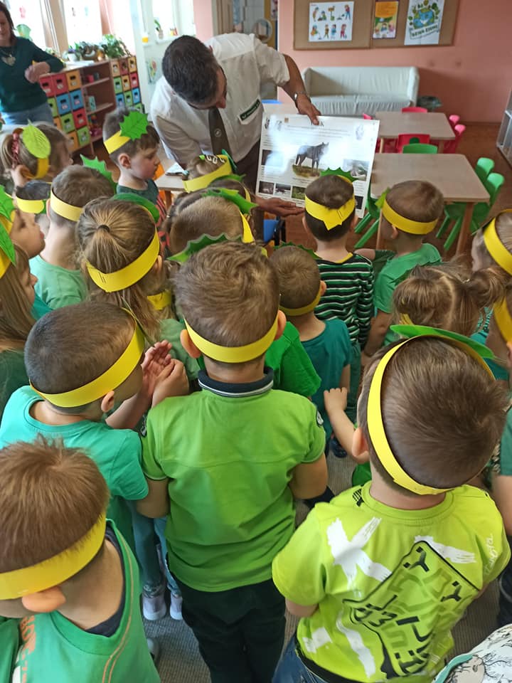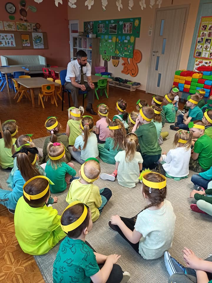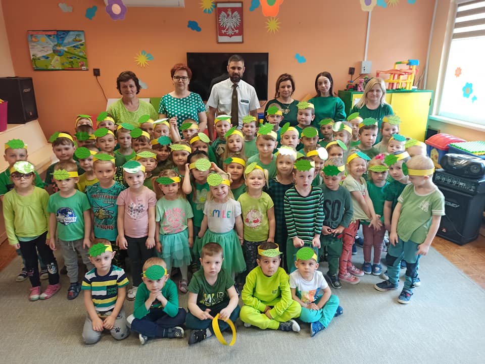 22 kwietnia przedszkolaki obchodziły Dzień Ziemi. Na spotkanie i obchody święta do przedszkola zaproszony został leśnik z Nadleśnictwo Turek - Lasy Państwowe pan Szymon Wasiak. Dzień Ziemi w przedszkolu był okazją, aby porozmawiać z dziećmi na podstawowe tematy związane z ochroną środowiska. Zebrane w jednej sali przedszkolaki słuchały m.in. o segregowaniu śmieci i niewyrzucaniu ich do lasu, o oszczędzaniu wody oraz o ochronie zwierząt i roślin.