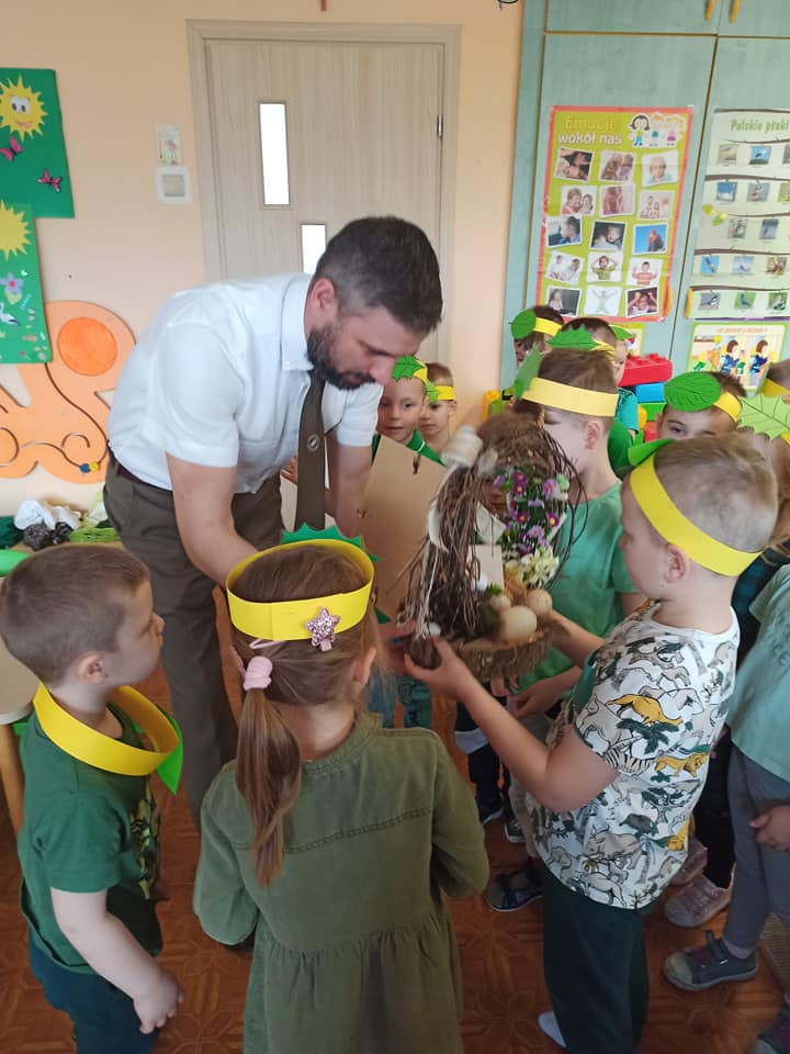 W ramach podziękowań na koniec dzieci wręczyły Panu Leśnikowi pamiątkowy dyplom oraz drobny upominek, natomiast Pan Leśniczy przekazał książki o ochronie lasu i zwierząt każdej grupie przedszkolnej.