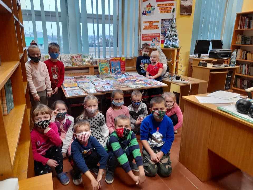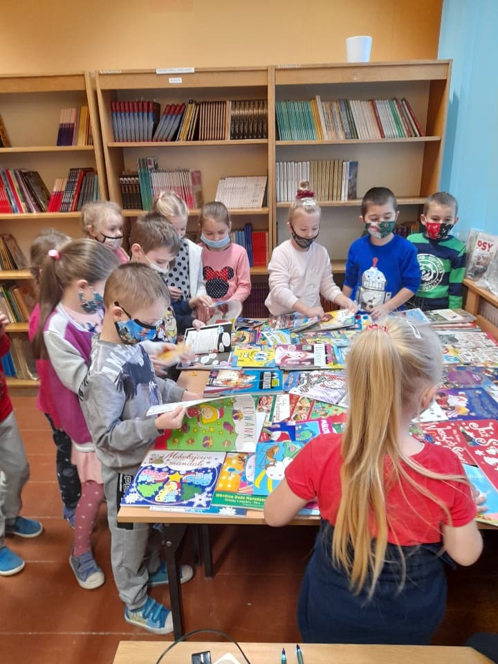 Wizyta dzieci z oddziału "0" w bibliotece szkolnej na kiermaszu książek.