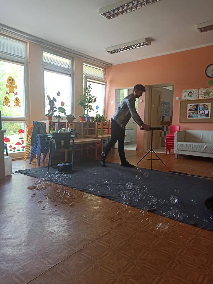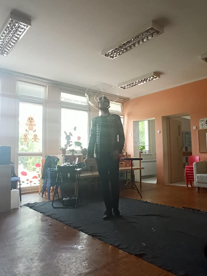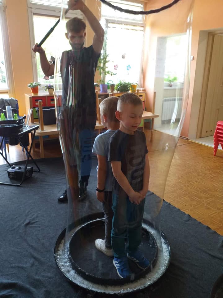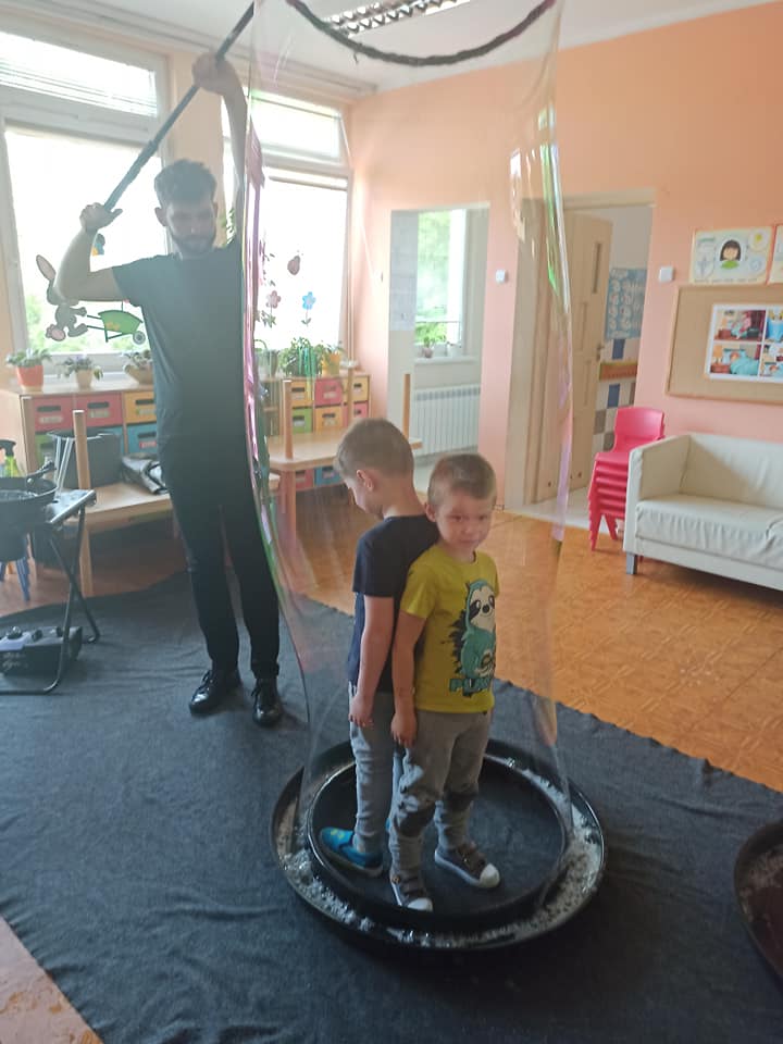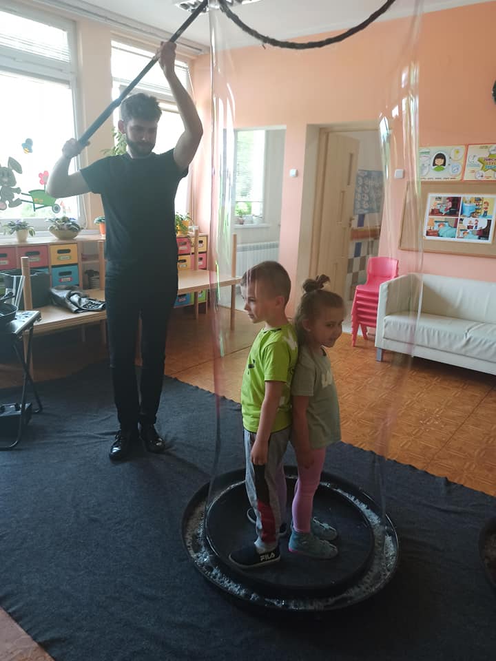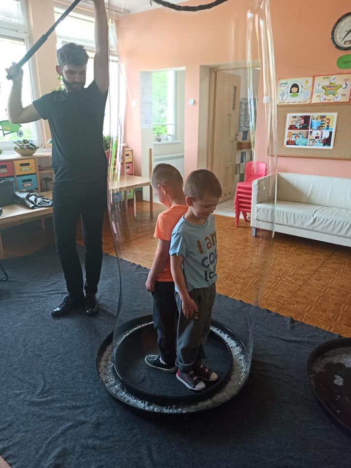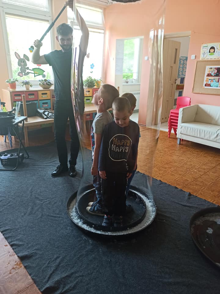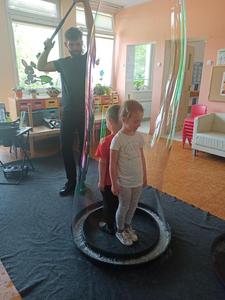 W poniedziałek 16 maja 2022 r. w naszym przedszkolu gościł Arkadiusz Gwizdała, uczestnik programu telewizyjnego ,,Mam talent ”, który przeniósł wszystkich w magiczny świat baniek mydlanych.
