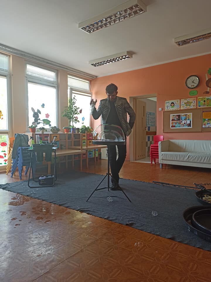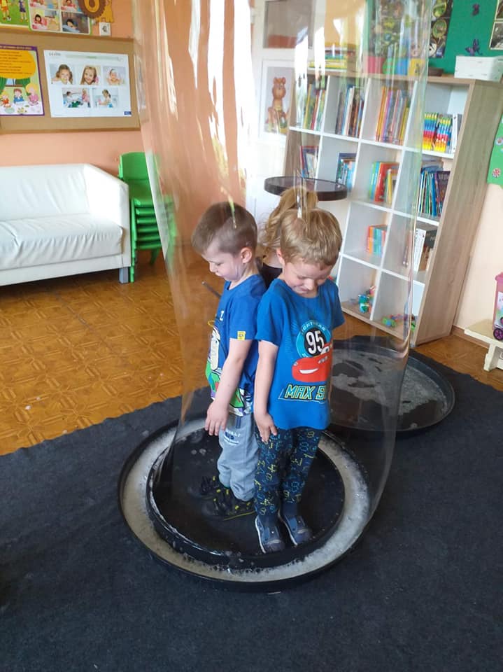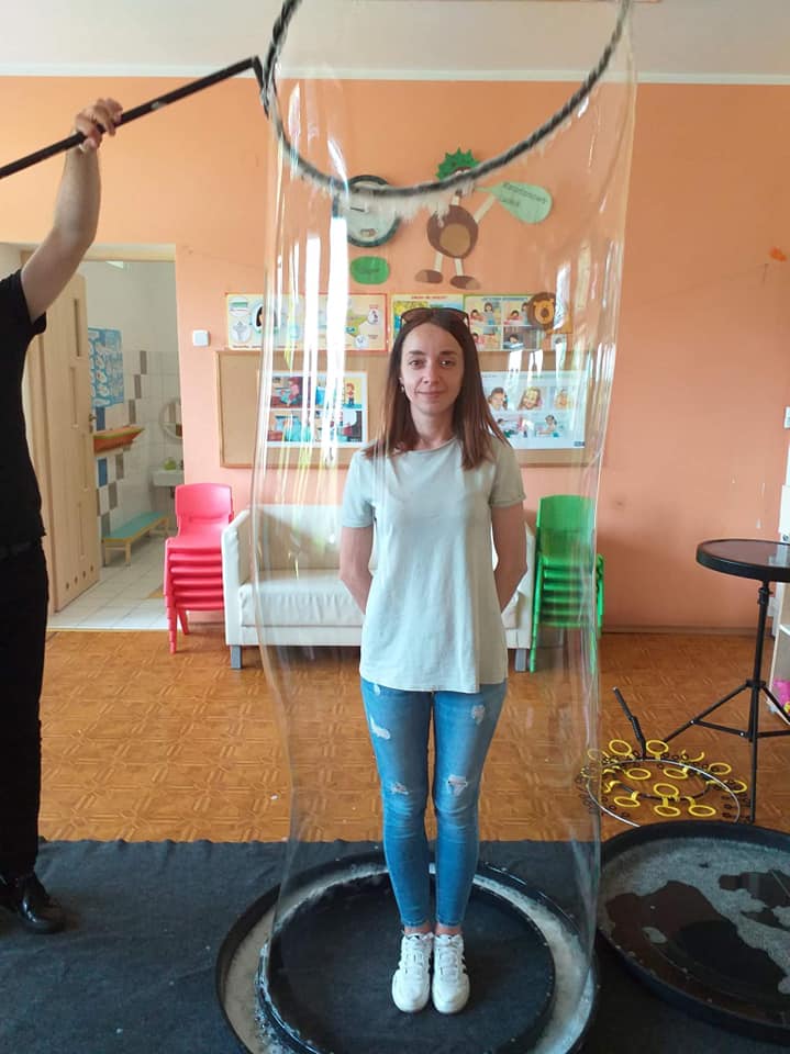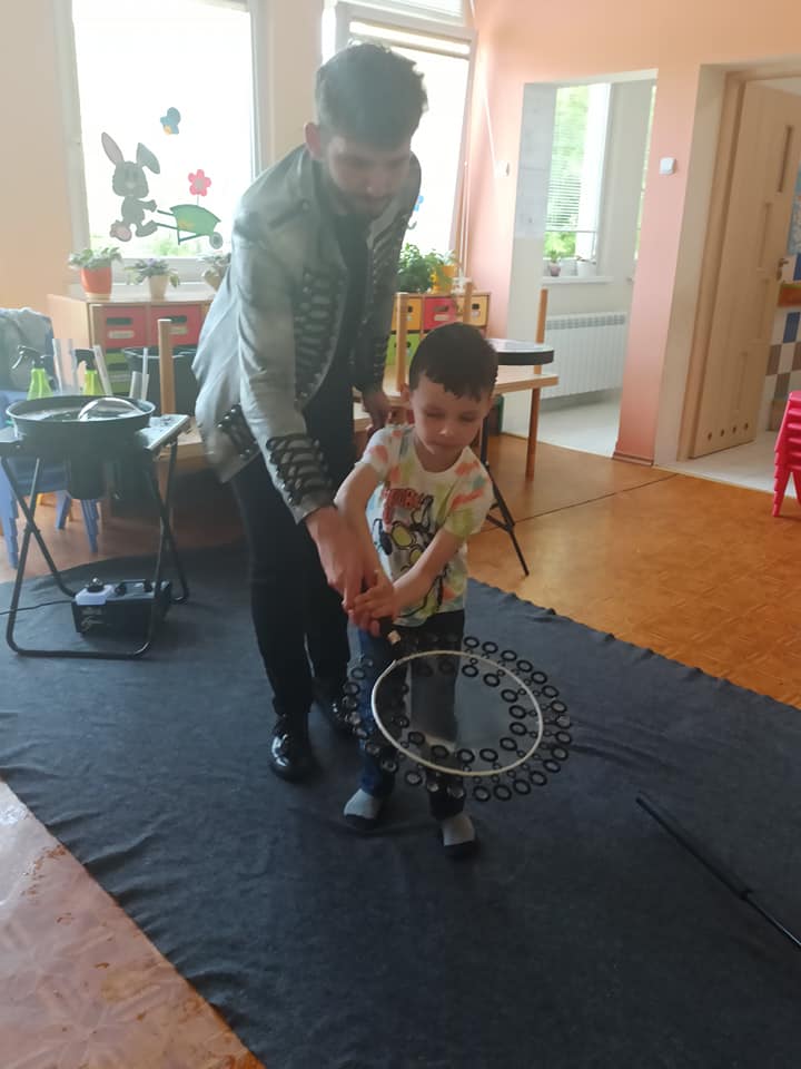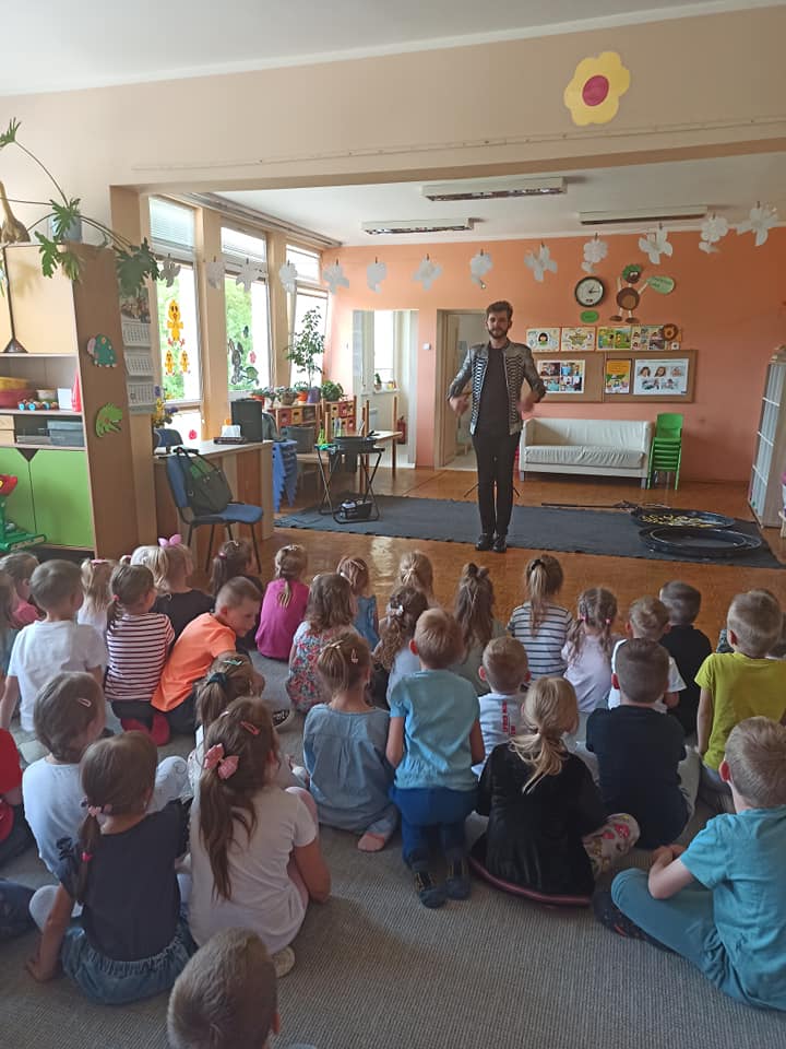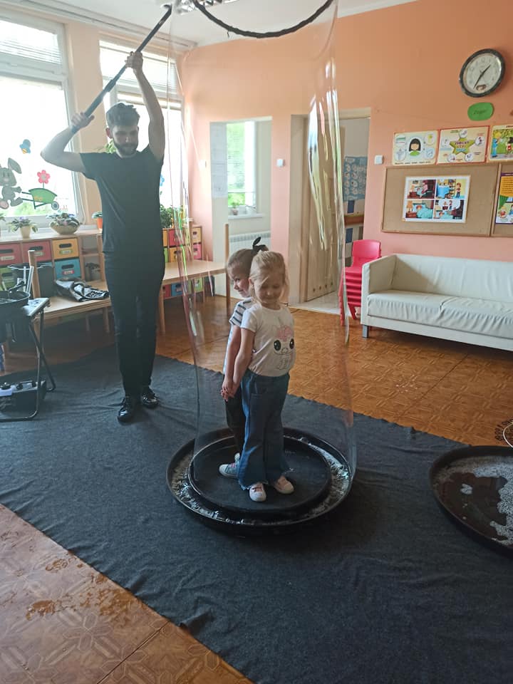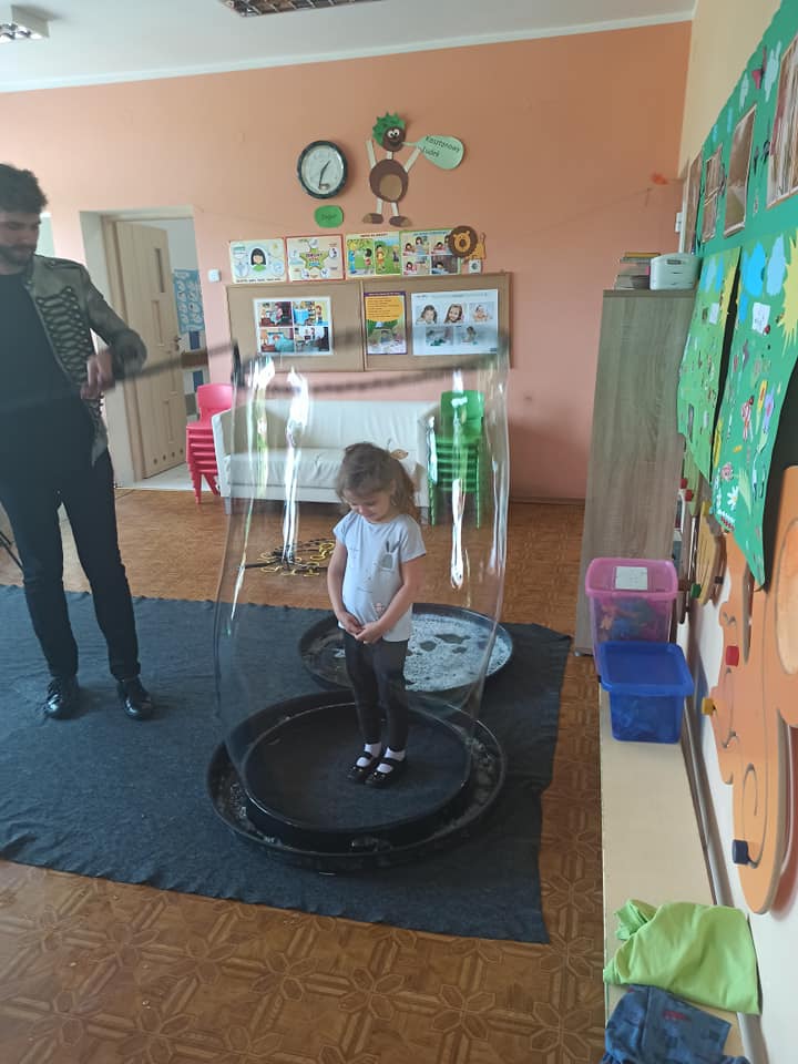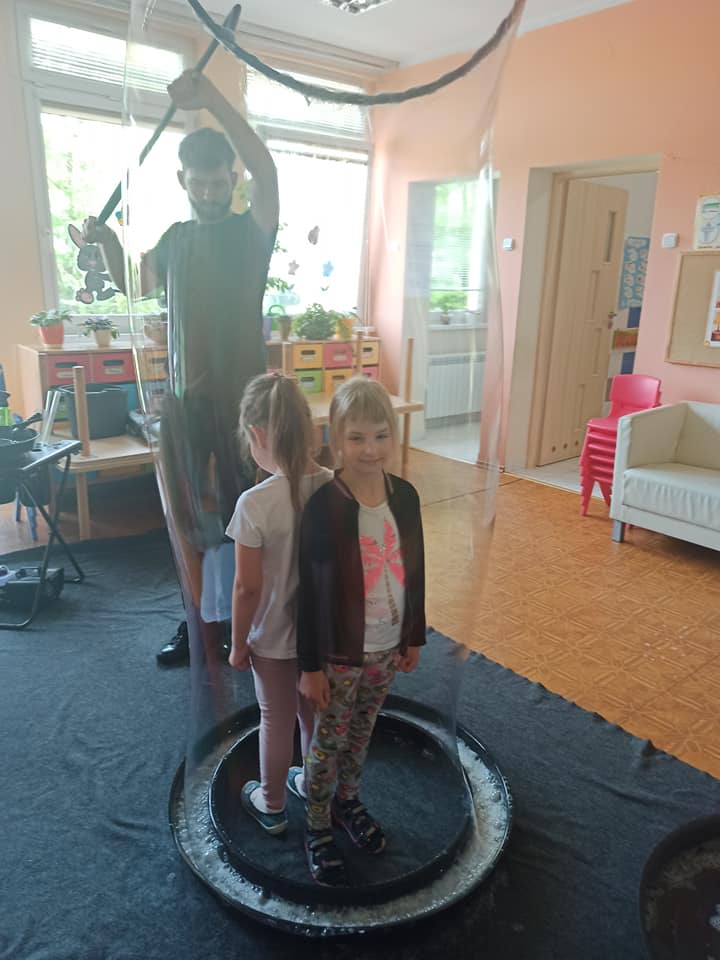 W poniedziałek 16 maja 2022 r. w naszym przedszkolu gościł Arkadiusz Gwizdała, uczestnik programu telewizyjnego ,,Mam talent ”, który przeniósł wszystkich w magiczny świat baniek mydlanych.