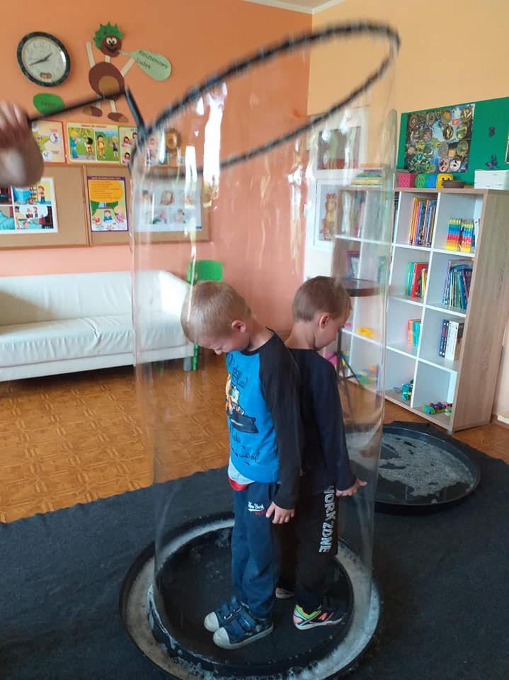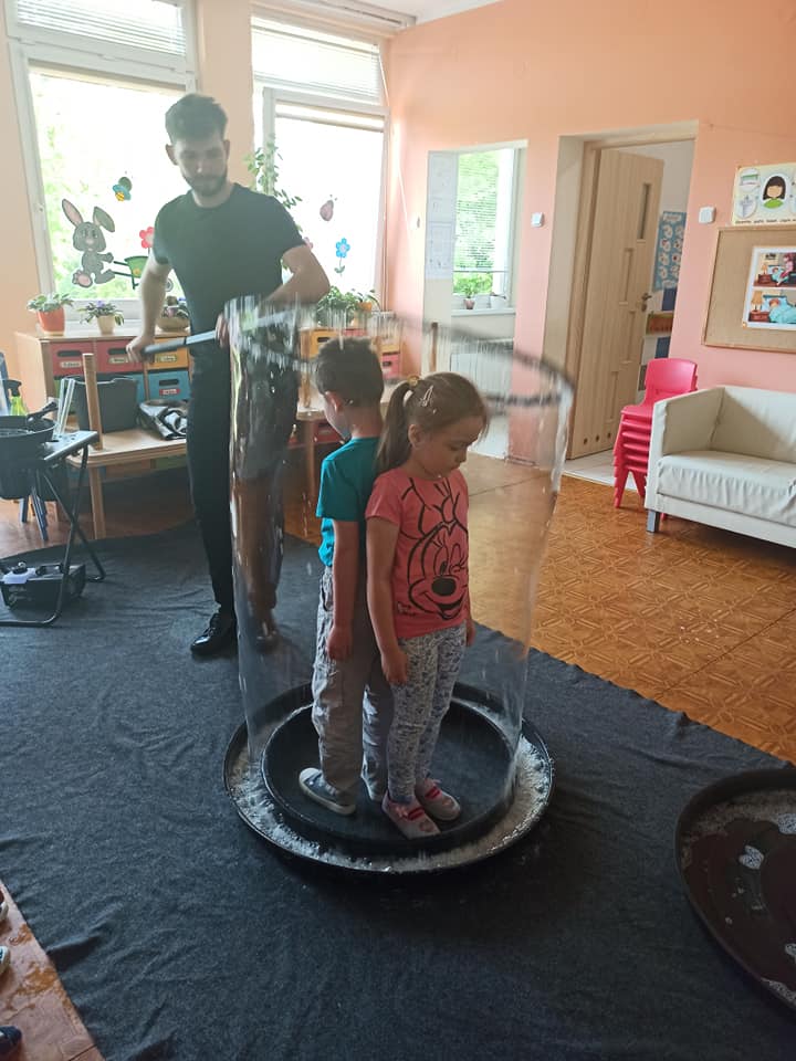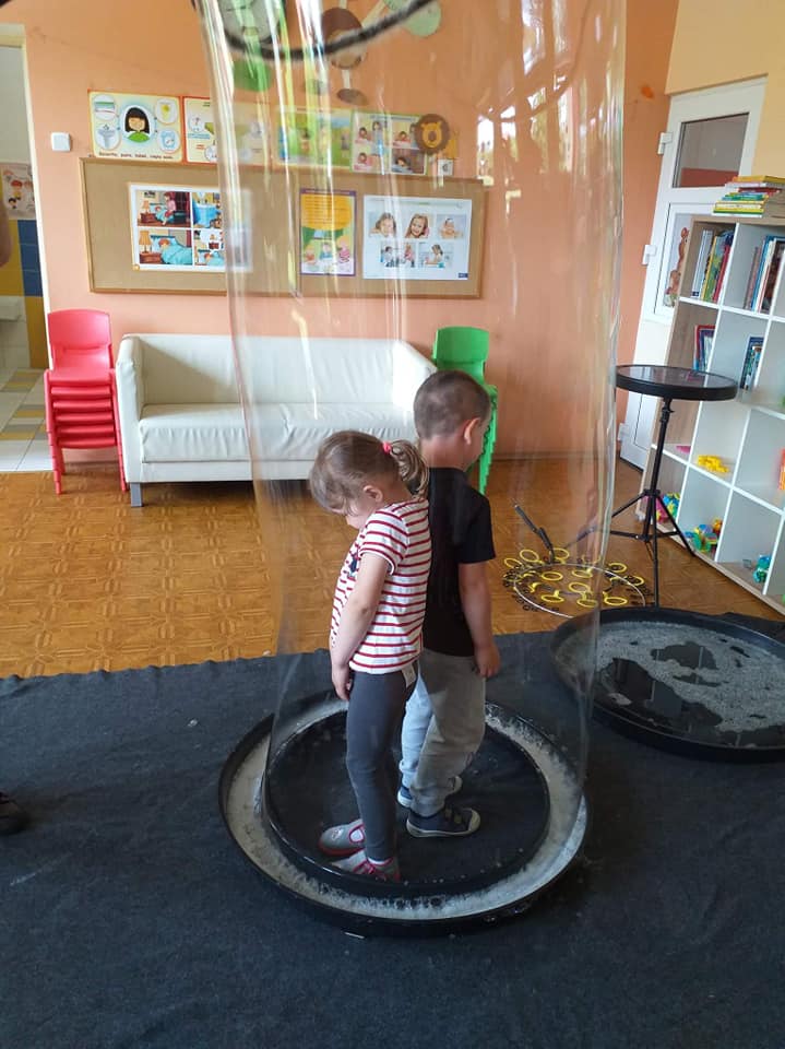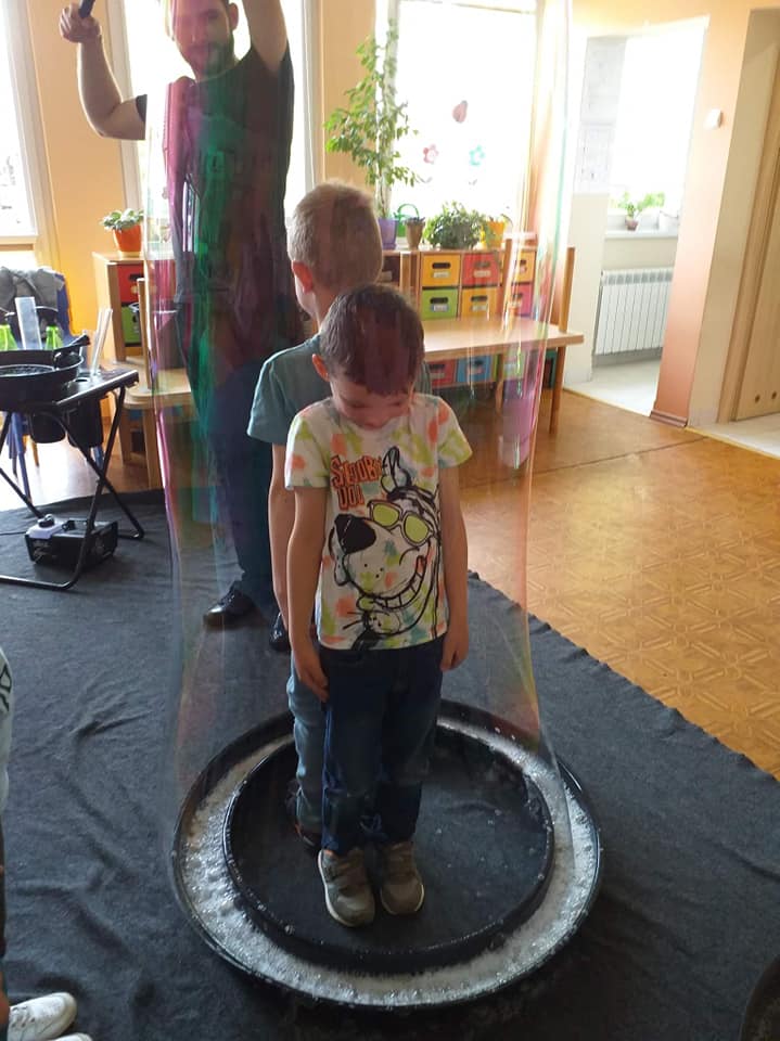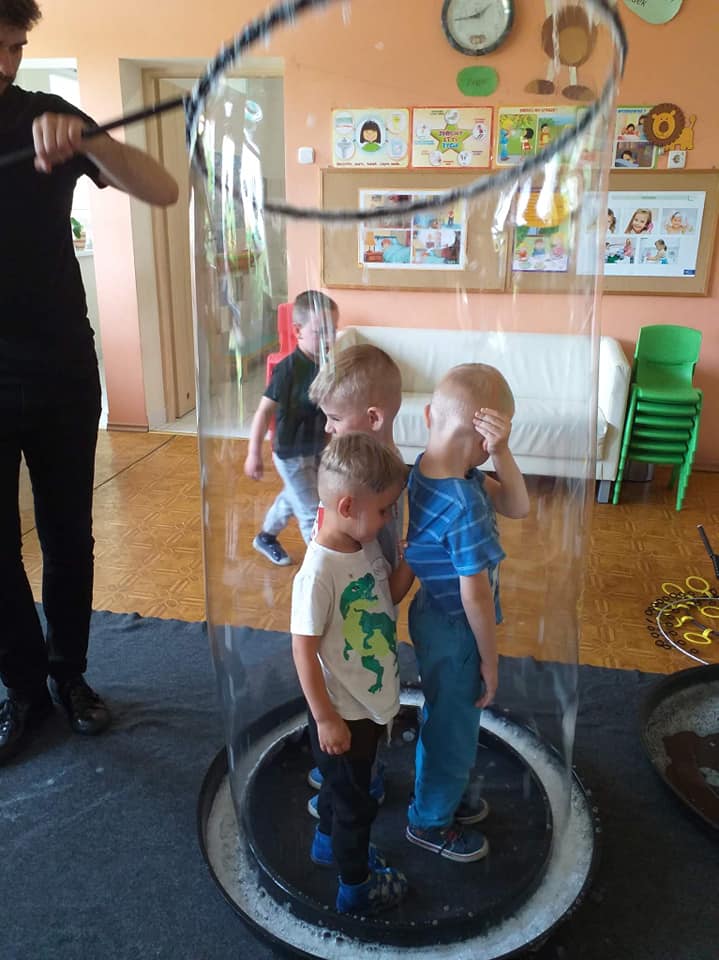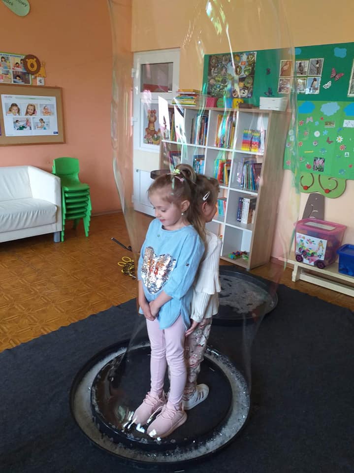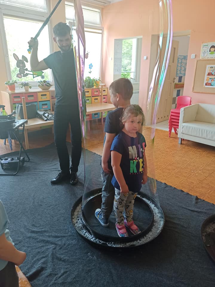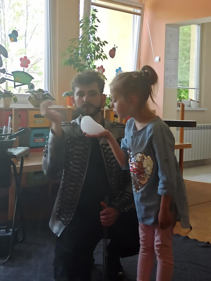 W poniedziałek 16 maja 2022 r. w naszym przedszkolu gościł Arkadiusz Gwizdała, uczestnik programu telewizyjnego ,,Mam talent ”, który przeniósł wszystkich w magiczny świat baniek mydlanych.