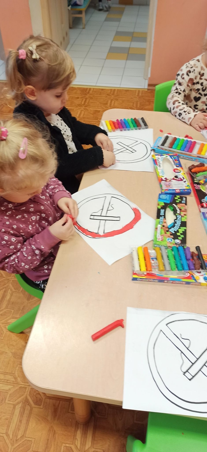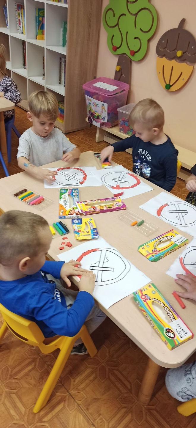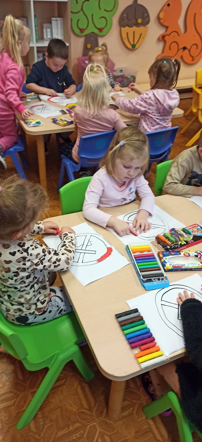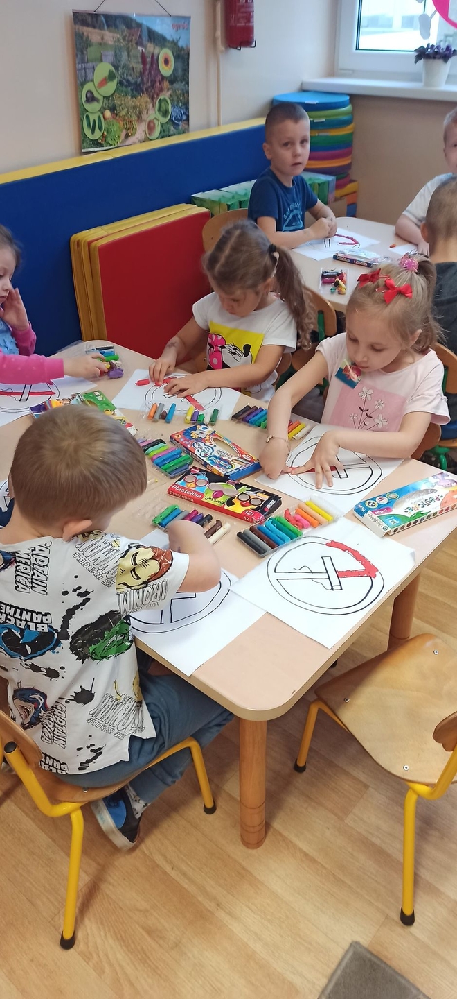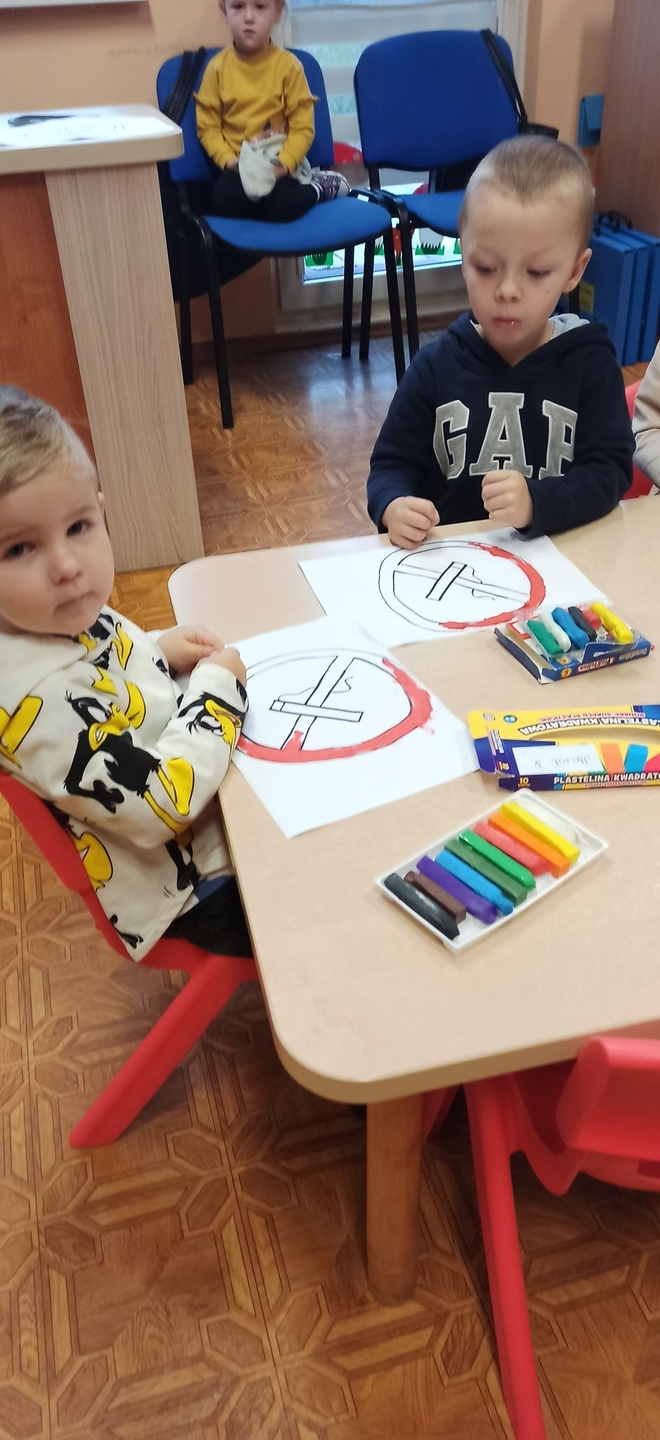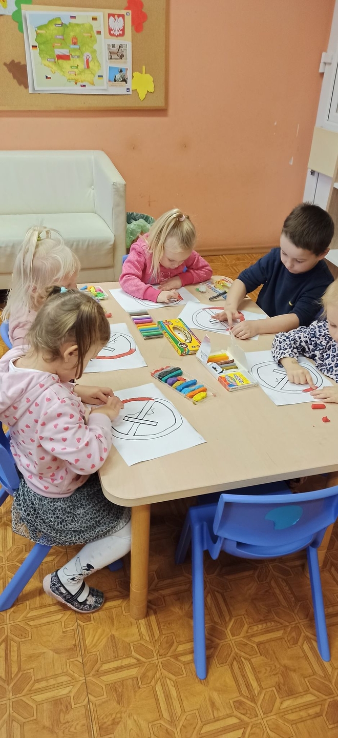 Celem zajęć było: promowanie zdrowego stylu życia oraz kształtowanie postawy odpowiedzialności za własne zdrowie. Nasze przedszkolaki zostały zapoznane z negatywnymi skutkami palenia poprzez pogadanki propagujące zdrowy styl życia, a także zajęcia plastyczne, na których za pomocą różnych technik plastycznych dzieci wykonywały znaki zakazu palenia nawiązujące do Światowego Dnia Rzucania Palenia. We wszystkich salach przedszkolnych wyeksponowano rysunkowe znaki ,,zakazu palenia papierosów’’ i pokazano dzieciom, w których miejscach znajdują się one w placówce.
