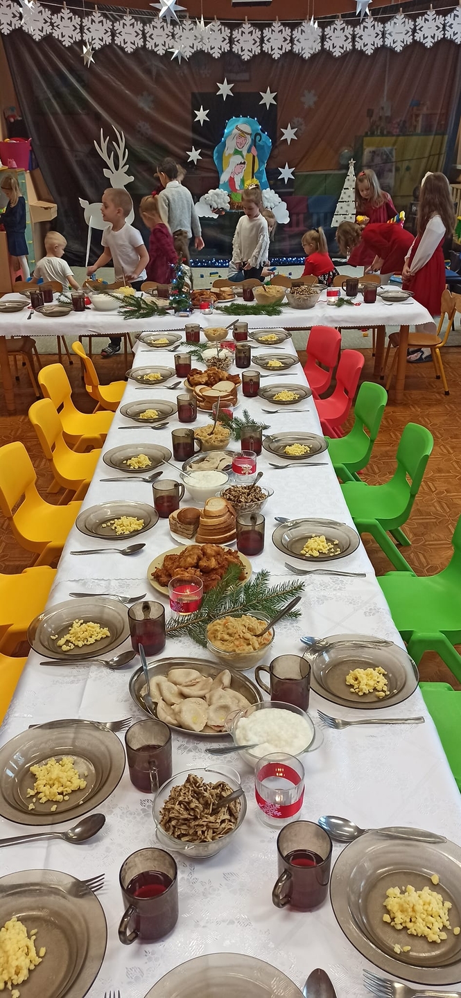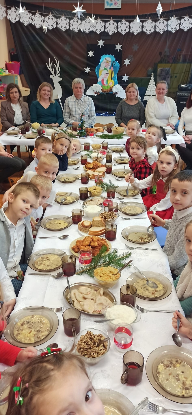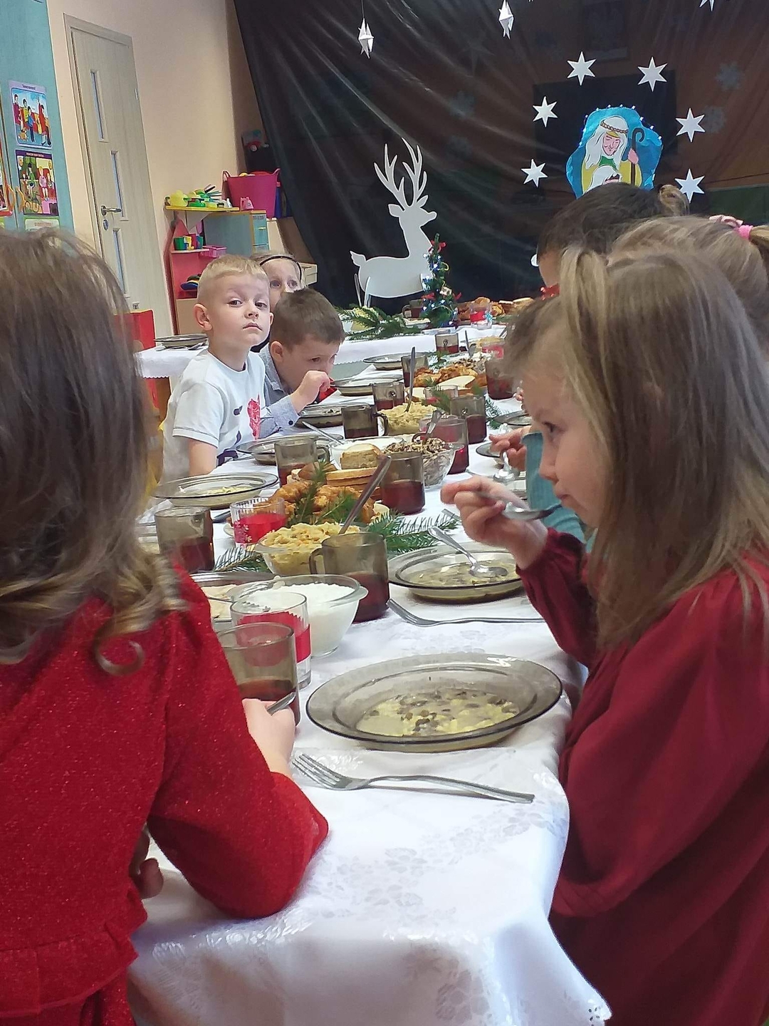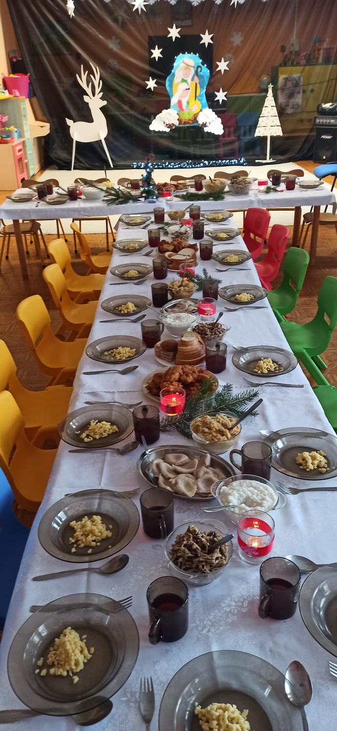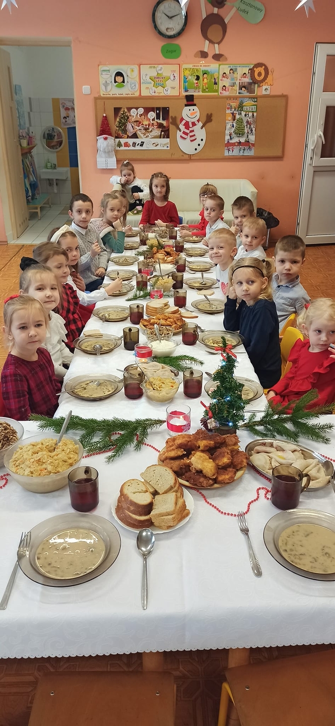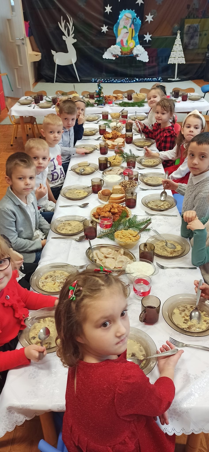W środę 21 grudnia 2022 r. odbyła się w naszym przedszkolu Wigilia. Święta Bożego Narodzenia to magiczny czas. Dla wielu z nas jest to dzień niezwykle radosny, spędzony w gronie najbliższych. Dzisiaj dzieci wspólnie z Paniami kolędowały, składały sobie życzenia i jadły wspólny świąteczny obiad przy pięknie udekorowanym stole. Dzieci zajadały tradycyjną rybkę, kapustę z grochem i pierogi, ale i nie zabrakło świątecznego piernika. Takie podniosłe chwile nie tylko utrwalają dzieciom znajomość tradycji i zwyczajów świątecznych, lecz również, co najważniejsze wzmacniają bliskie serdeczne relacje.??????