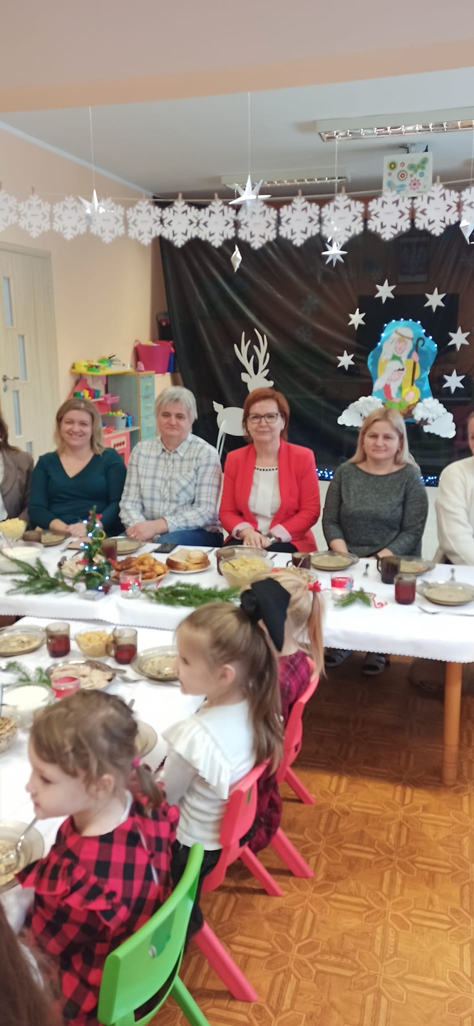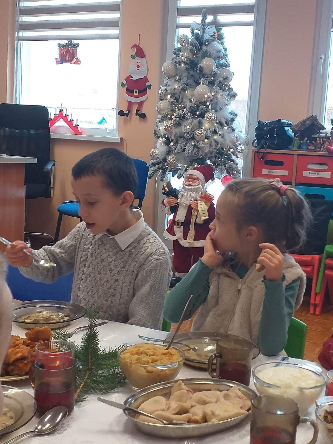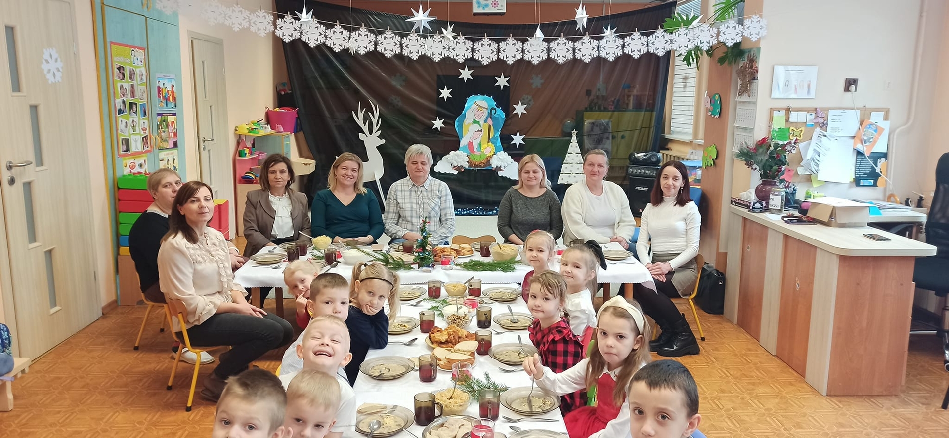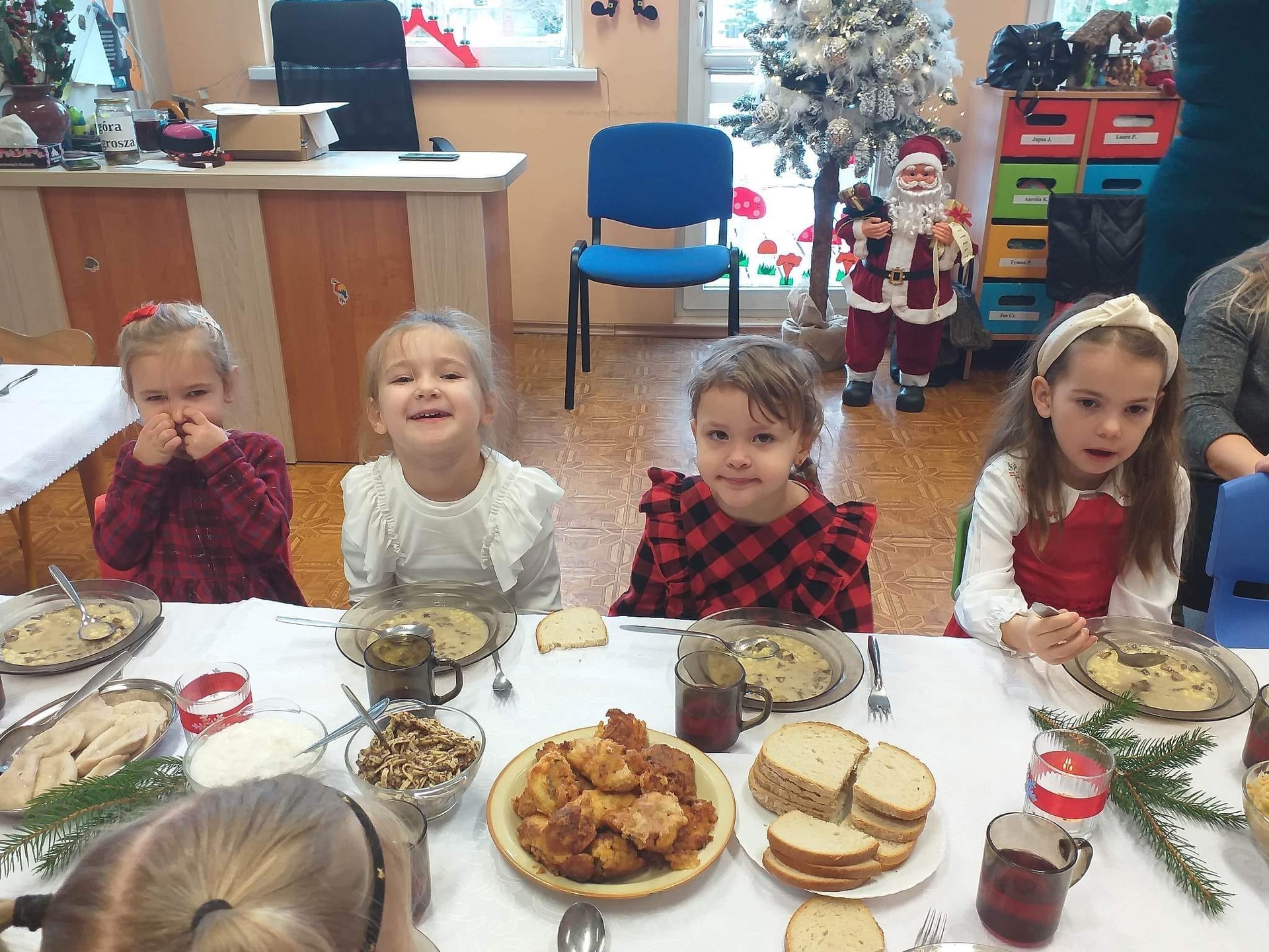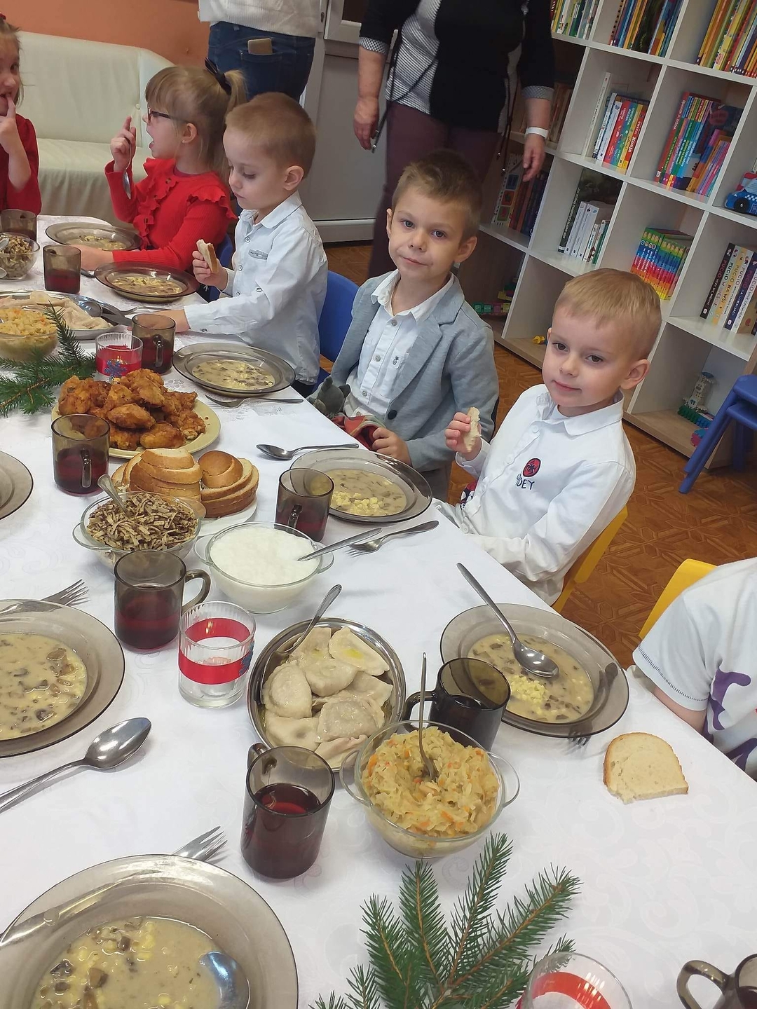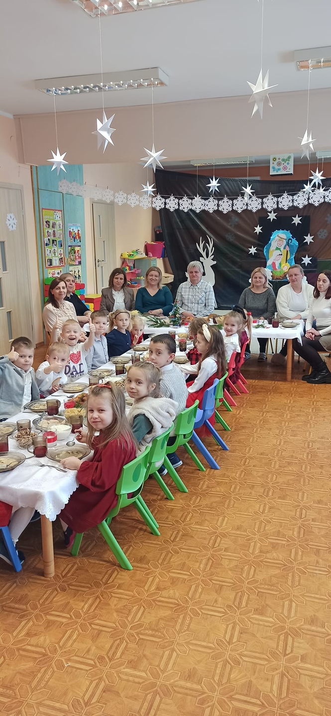 W środę 21 grudnia 2022 r. odbyła się w naszym przedszkolu Wigilia. Święta Bożego Narodzenia to magiczny czas. Dla wielu z nas jest to dzień niezwykle radosny, spędzony w gronie najbliższych. Dzisiaj dzieci wspólnie z Paniami kolędowały, składały sobie życzenia i jadły wspólny świąteczny obiad przy pięknie udekorowanym stole. Dzieci zajadały tradycyjną rybkę, kapustę z grochem i pierogi, ale i nie zabrakło świątecznego piernika. Takie podniosłe chwile nie tylko utrwalają dzieciom znajomość tradycji i zwyczajów świątecznych, lecz również, co najważniejsze wzmacniają bliskie serdeczne relacje.??????