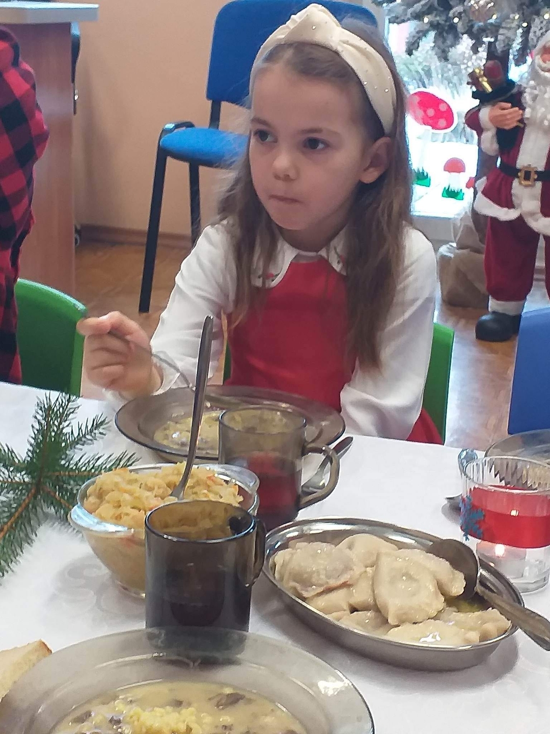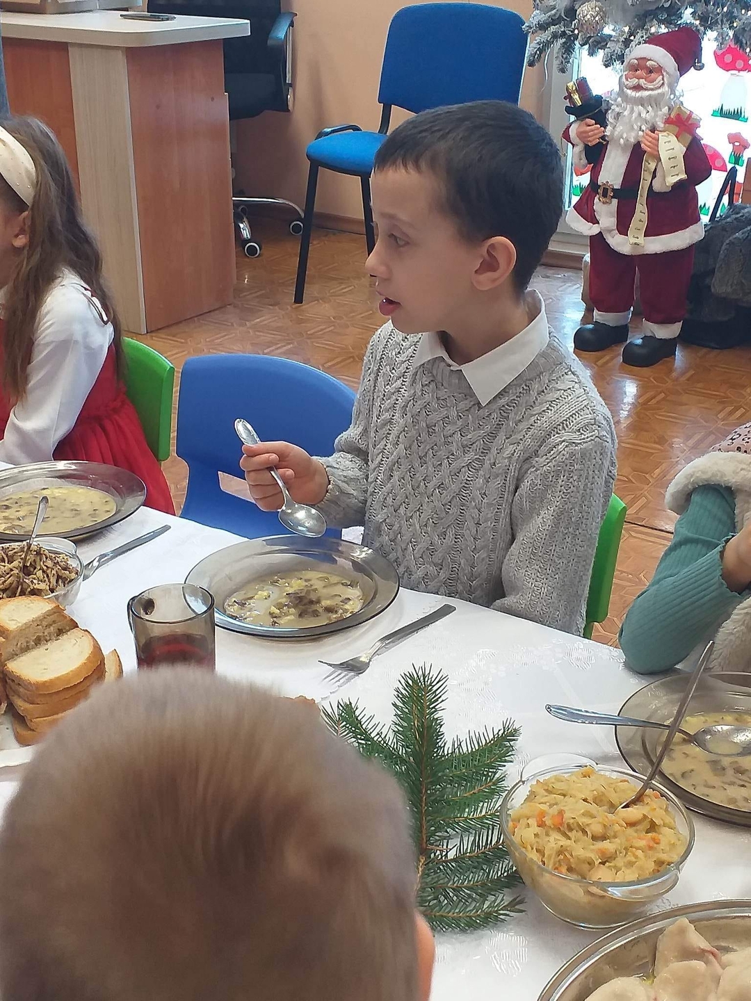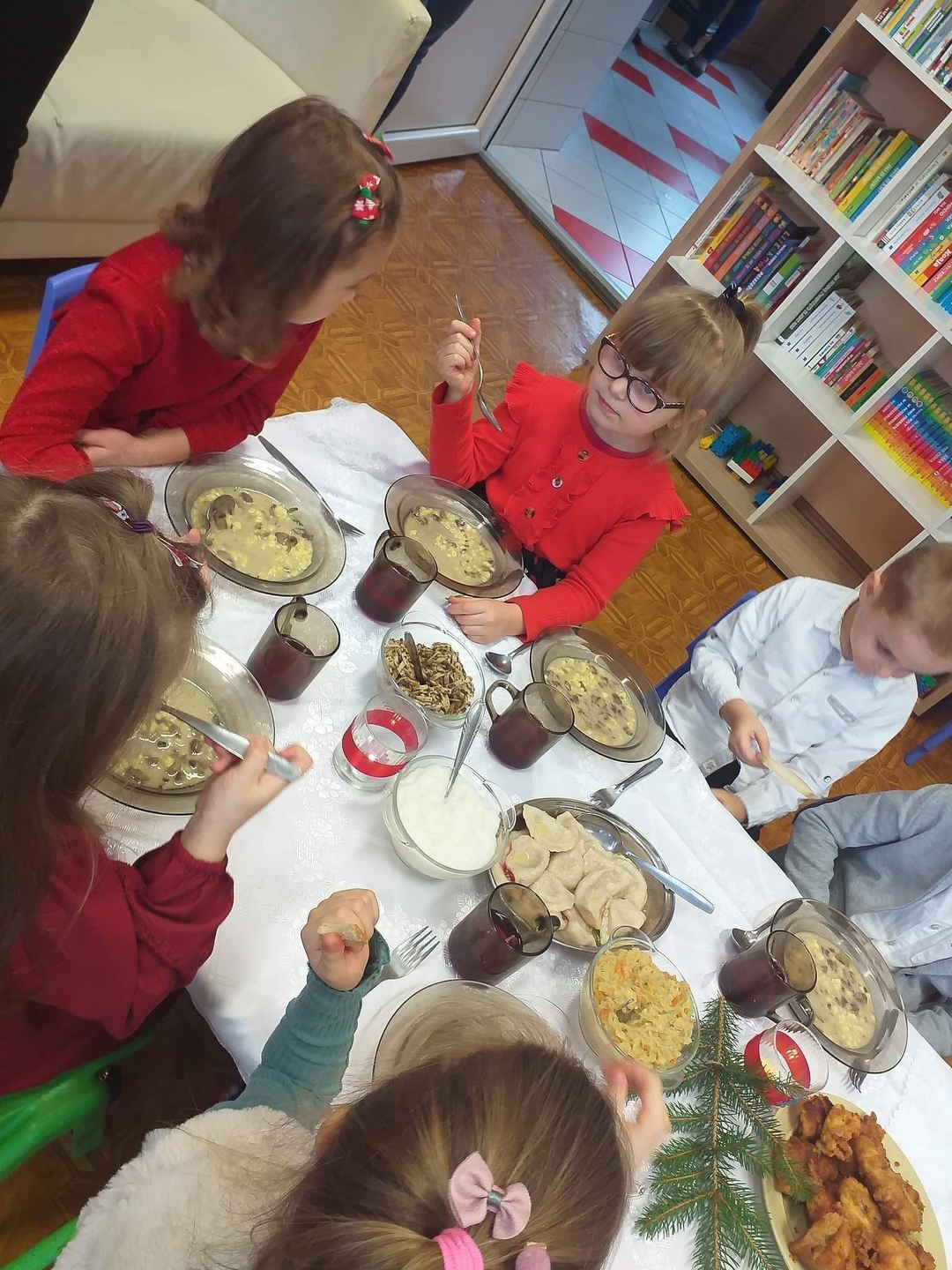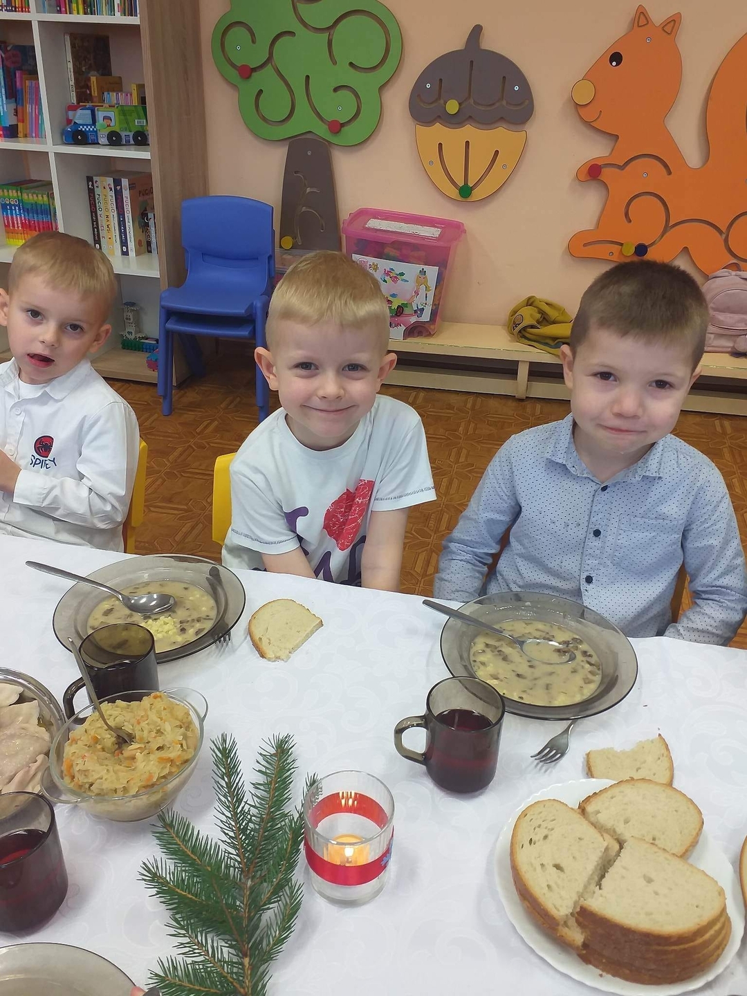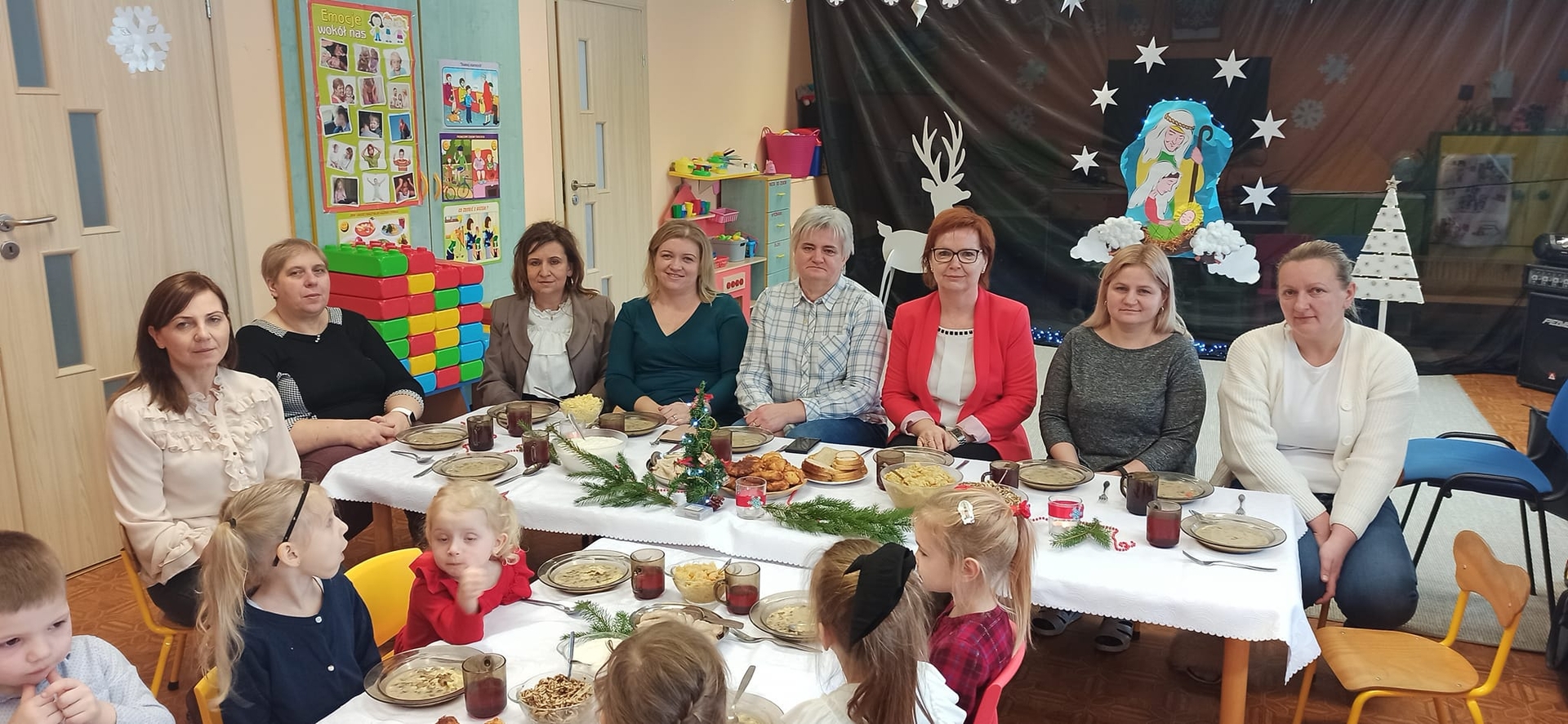 W środę 21 grudnia 2022 r. odbyła się w naszym przedszkolu Wigilia. Święta Bożego Narodzenia to magiczny czas. Dla wielu z nas jest to dzień niezwykle radosny, spędzony w gronie najbliższych. Dzisiaj dzieci wspólnie z Paniami kolędowały, składały sobie życzenia i jadły wspólny świąteczny obiad przy pięknie udekorowanym stole. Dzieci zajadały tradycyjną rybkę, kapustę z grochem i pierogi, ale i nie zabrakło świątecznego piernika. Takie podniosłe chwile nie tylko utrwalają dzieciom znajomość tradycji i zwyczajów świątecznych, lecz również, co najważniejsze wzmacniają bliskie serdeczne relacje.??????